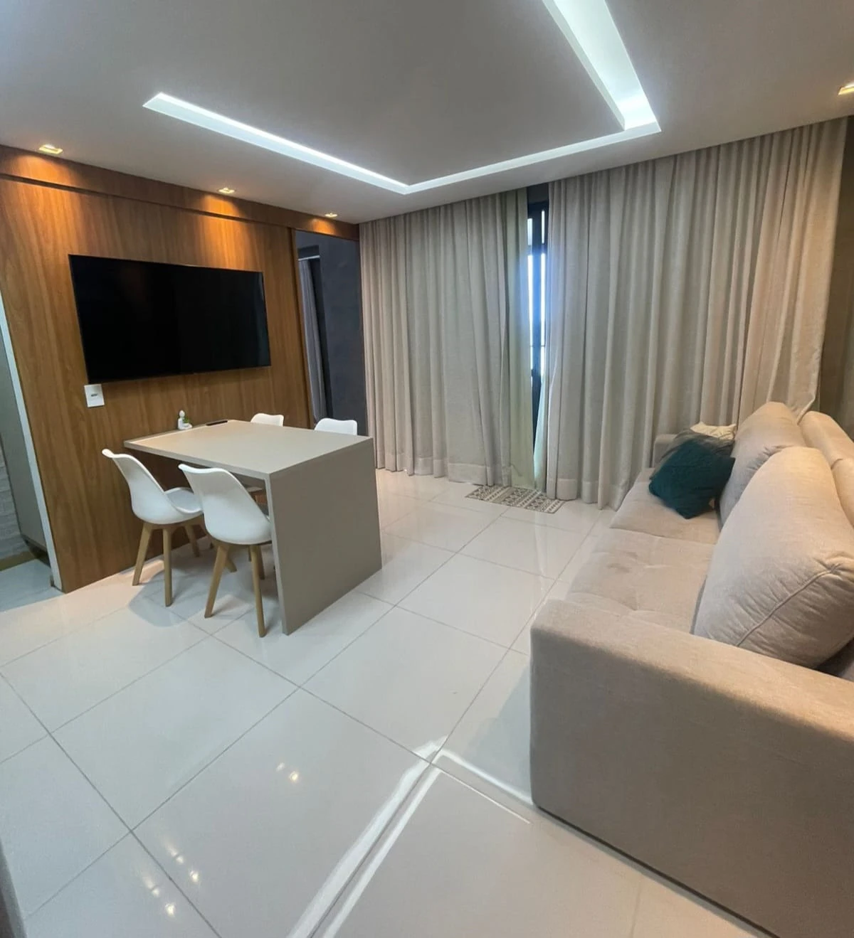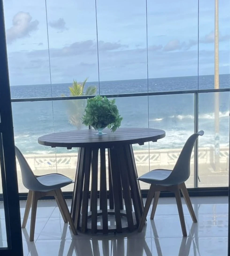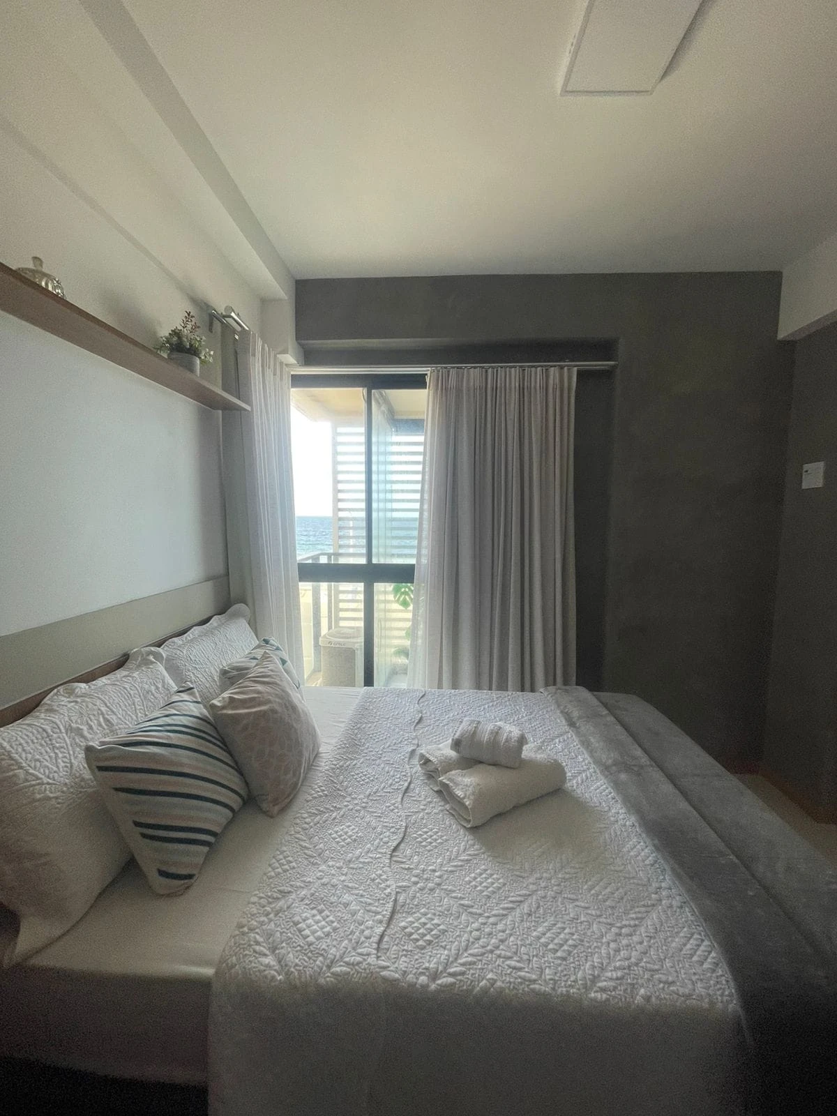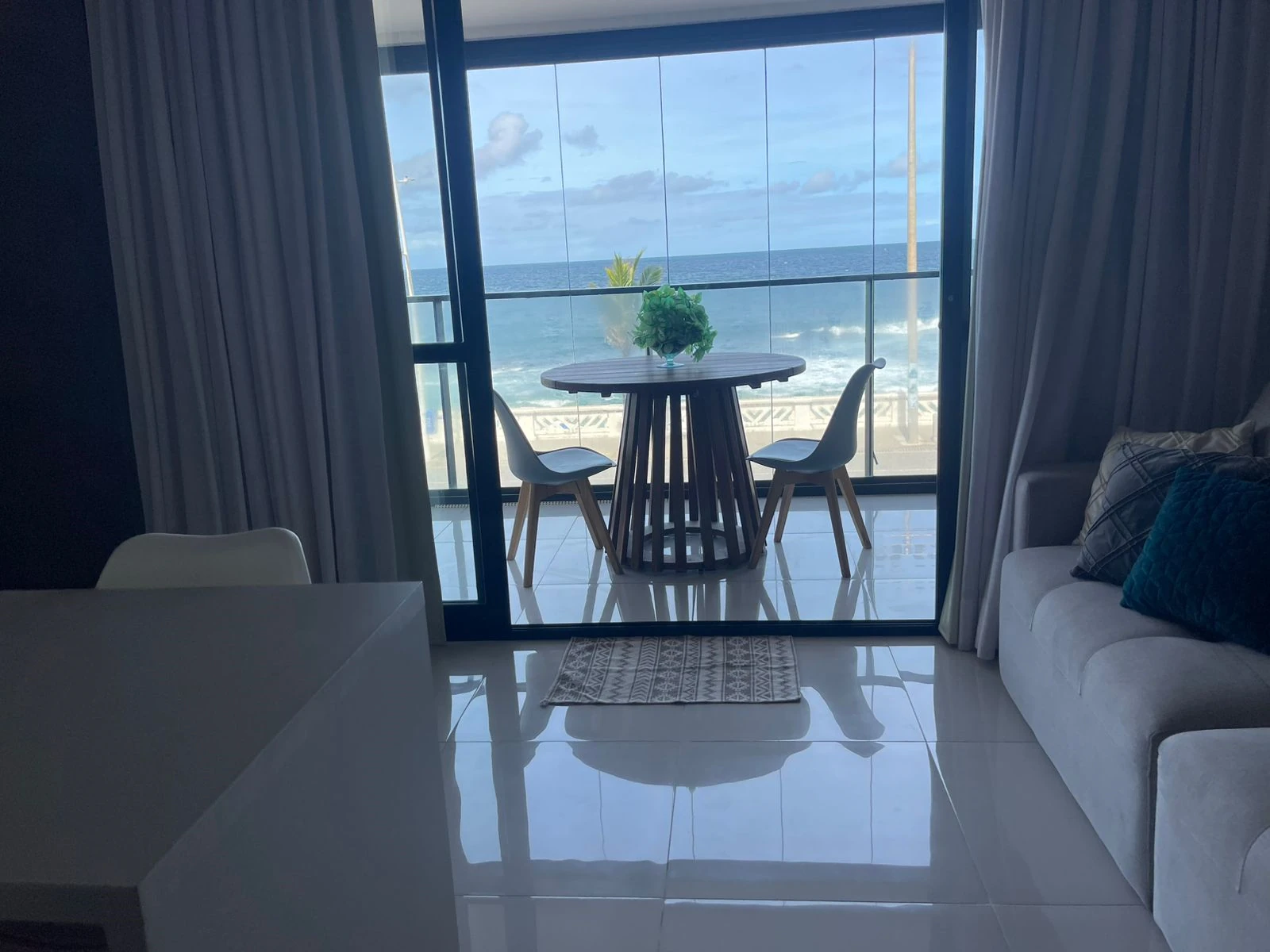 Apartamento quarto e sala vista mar à venda na Orla da Barra, 42 m², composto por sala, varanda gourmet, cozinha e uma vaga de garagem fixa.