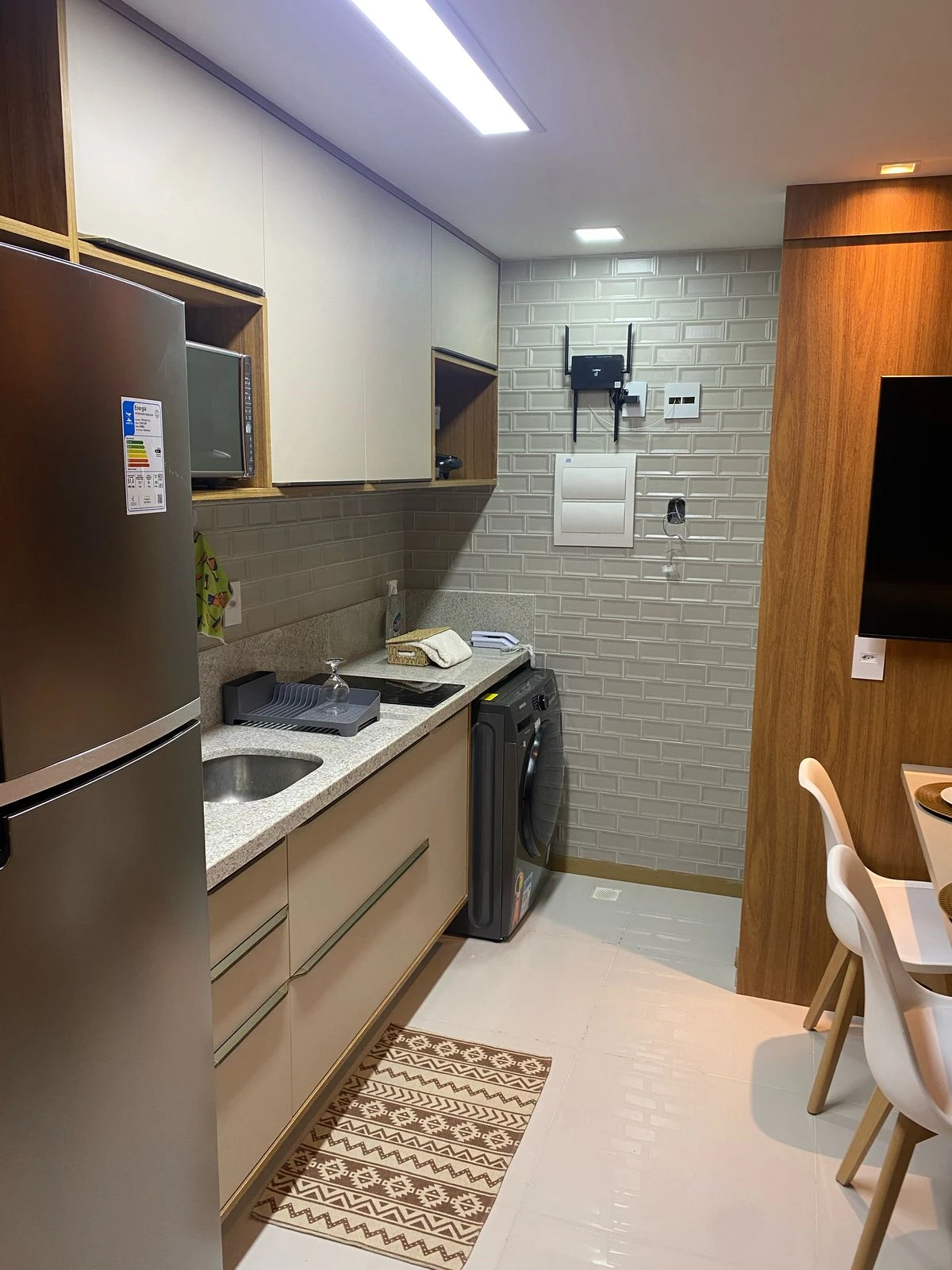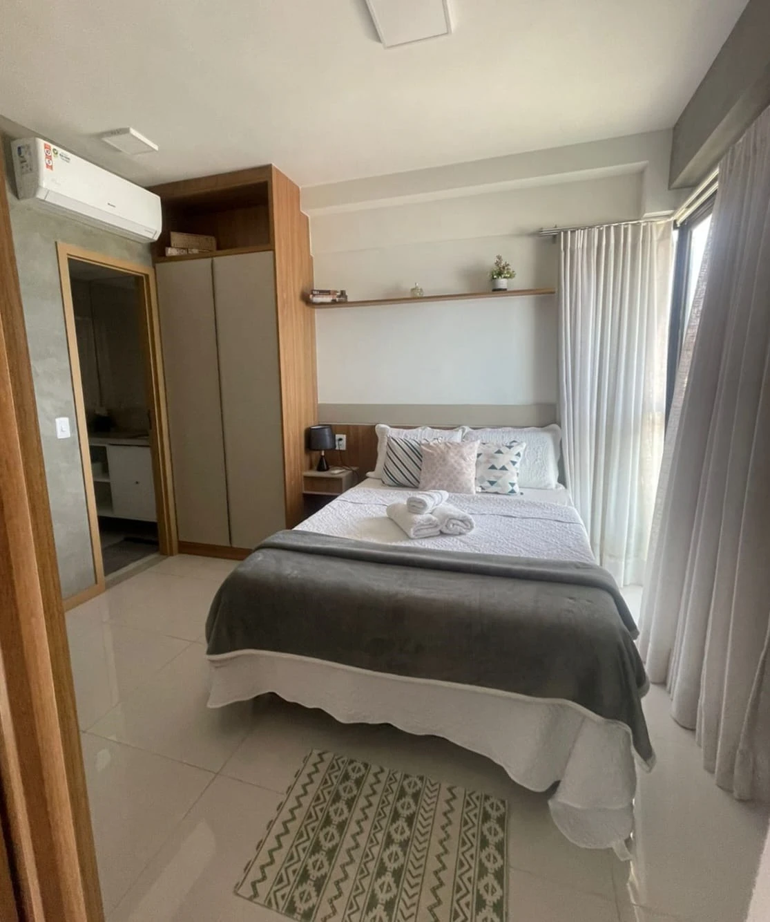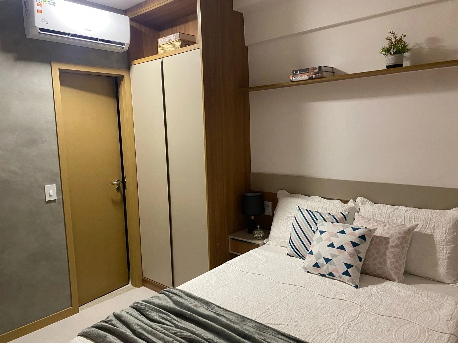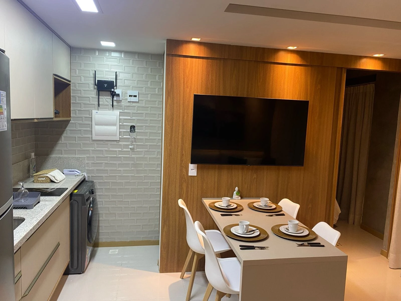 Apartamento quarto e sala vista mar à venda na Orla da Barra, 42 m², composto por sala, varanda gourmet, cozinha e uma vaga de garagem fixa.