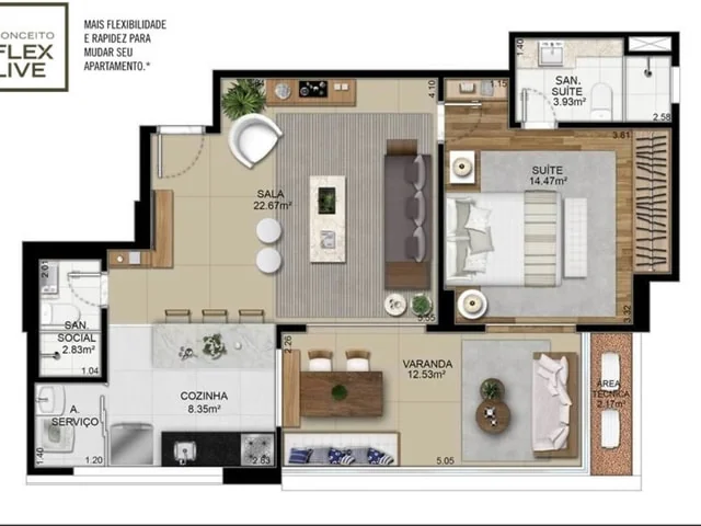 Amplo apartamento de quarto e sala com uma planta maravilhosa. São 67m2 com suíte, banheiro social, área de serviço com ventilação natural, cozinha, sala e varanda ampla e com muita privacidade. Armários no quarto, cozinha e banheiros. Vaga fixa, coberta e solta. Prédio com excelente infraestrutura.