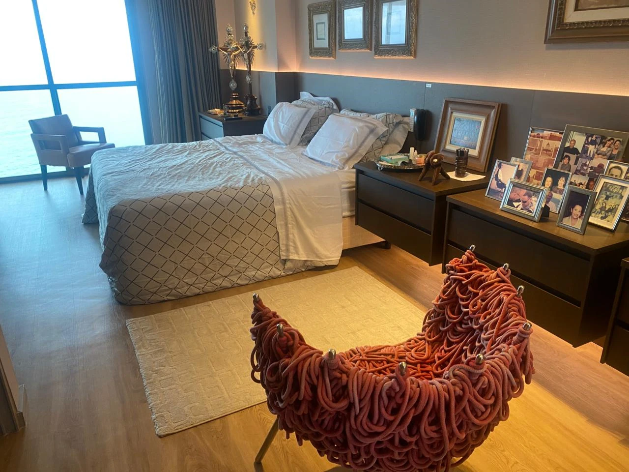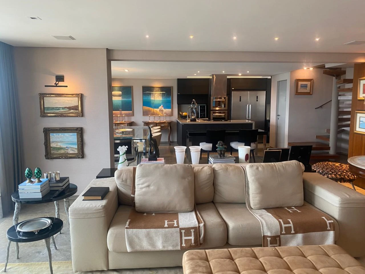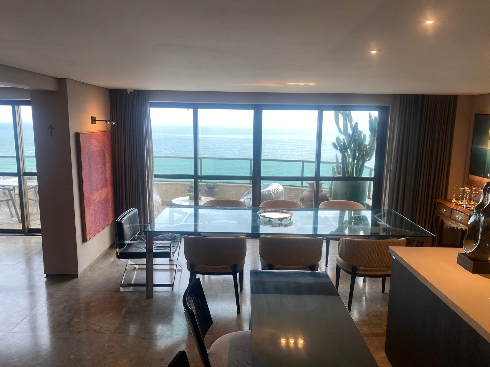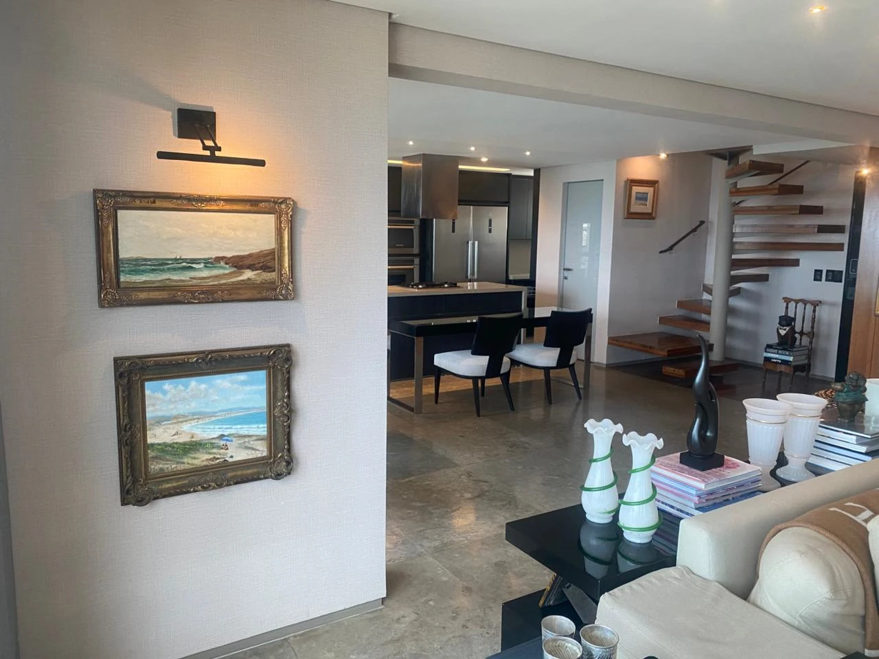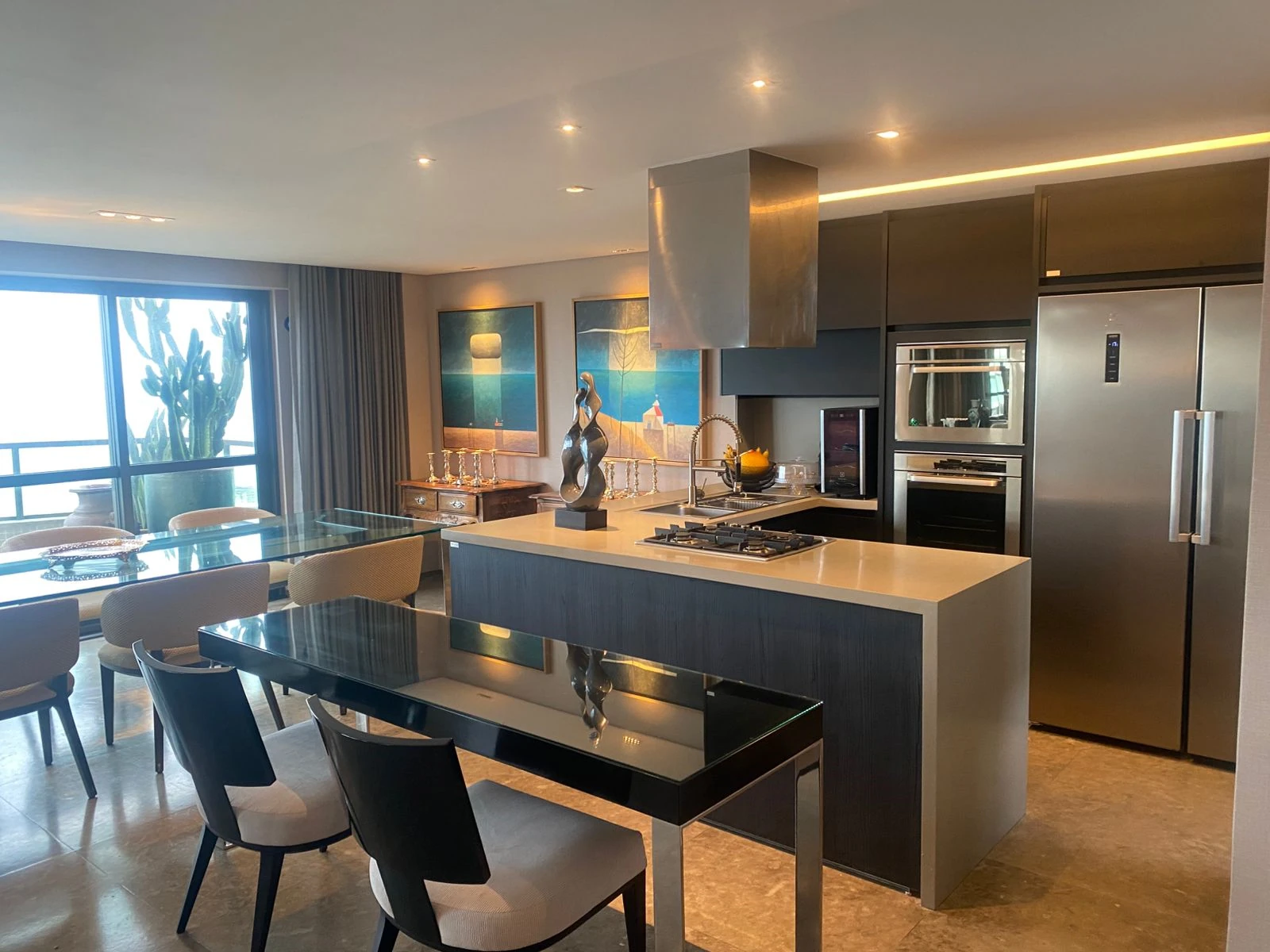 Finamente decorado e 100% mobiliado, composto de sala em dois ambientes e home theater, lavabo, varanda, cozinha, louçaria,, despensa, área e banheiro de servilo no pavimento inerior e 3 quartos sendo duas suíes com banheiro social (todos com vista mar), no pavimento superior. Todos os armários da Kitchens, móveis da Artefacto.