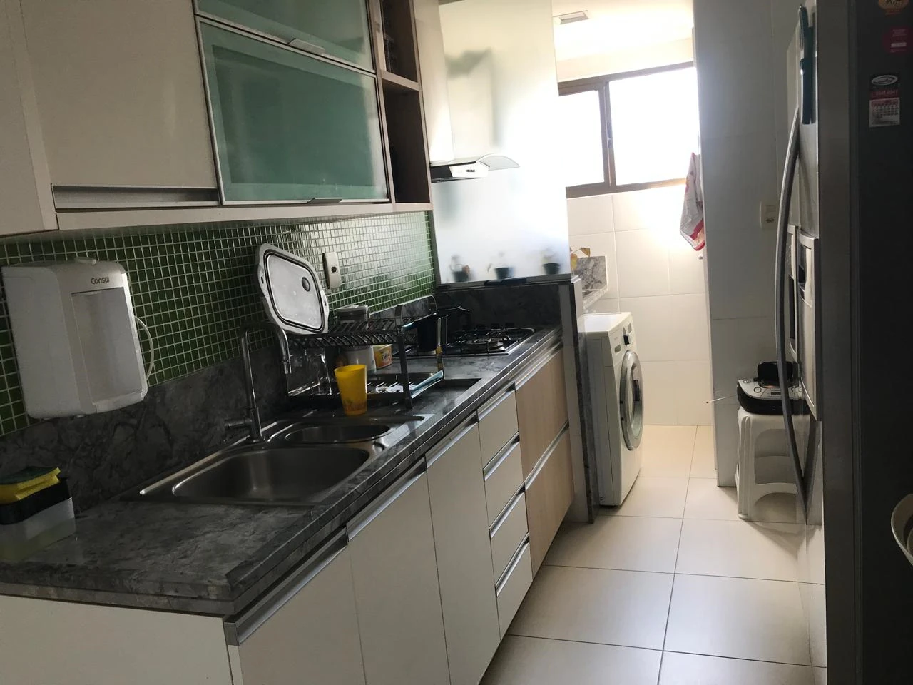 Apartamento dois quartos à venda no Costa Azul, 80 m². sendo uma suíte, duas salas, dois banheiros, cozinha, despensa, área de serviço e banheiro de serviço. Armários na cozinha e closet e duas vagas de garagem. Condomínio com piscina, salão de festas, vestiario, interfone.