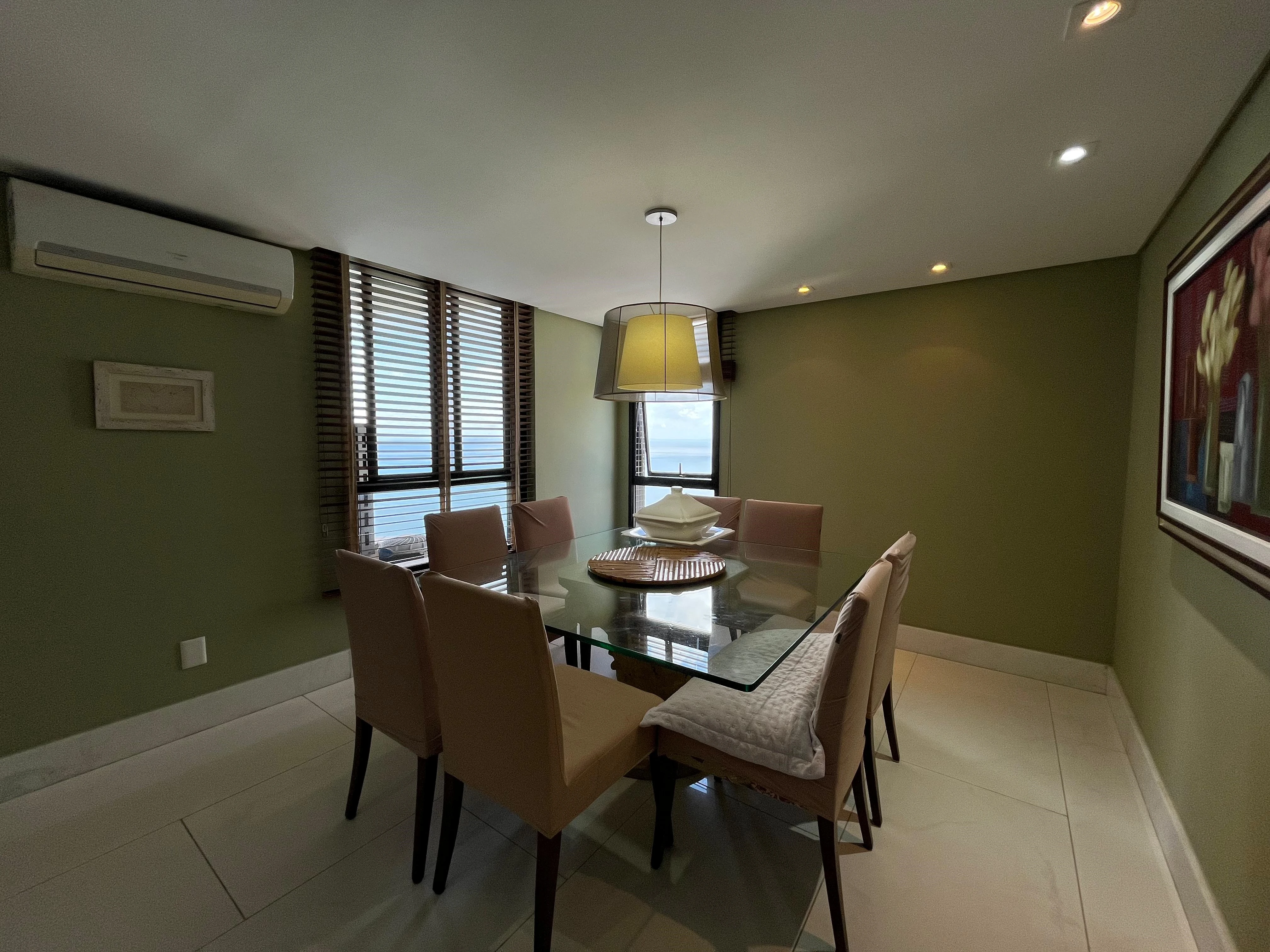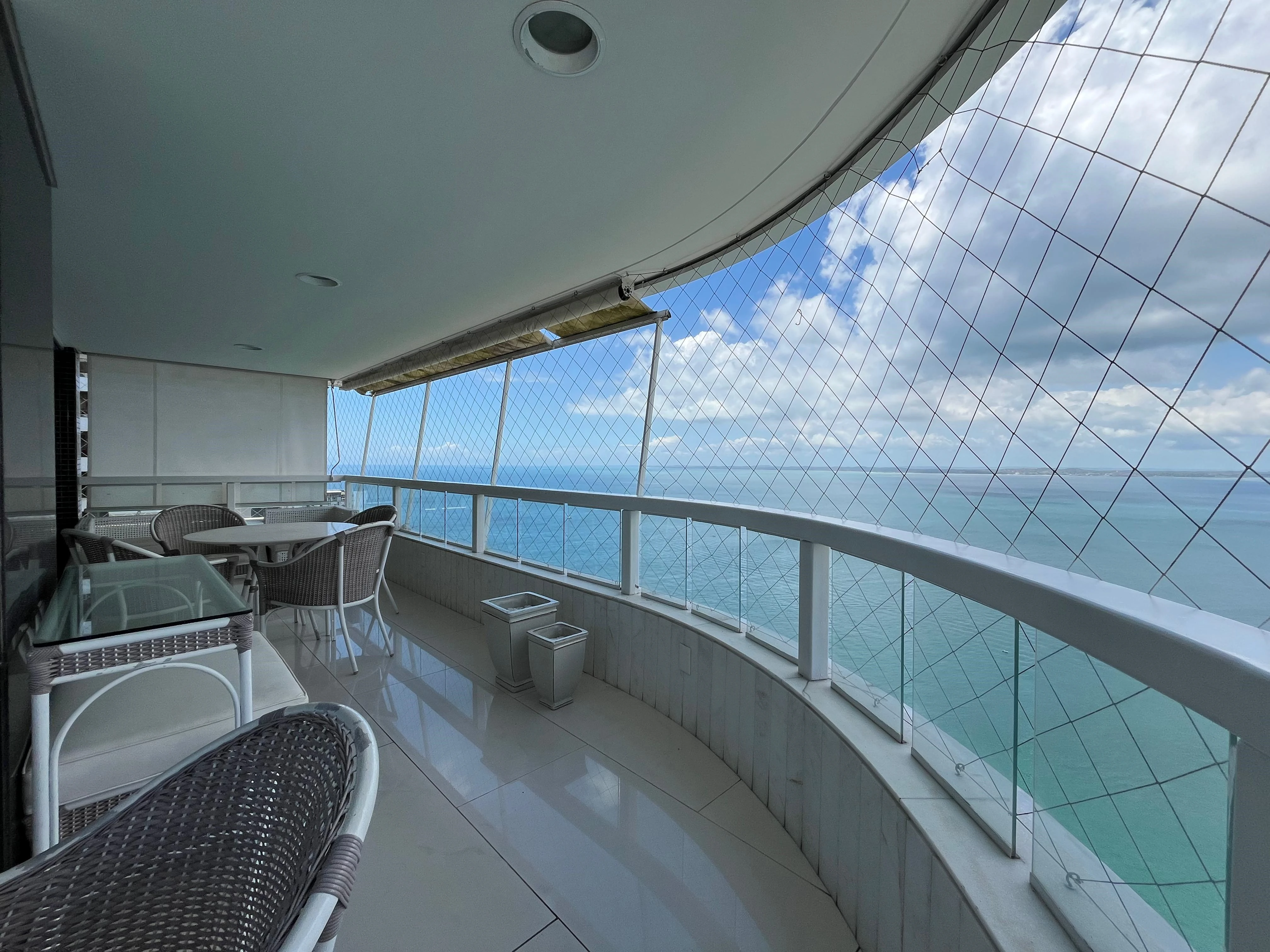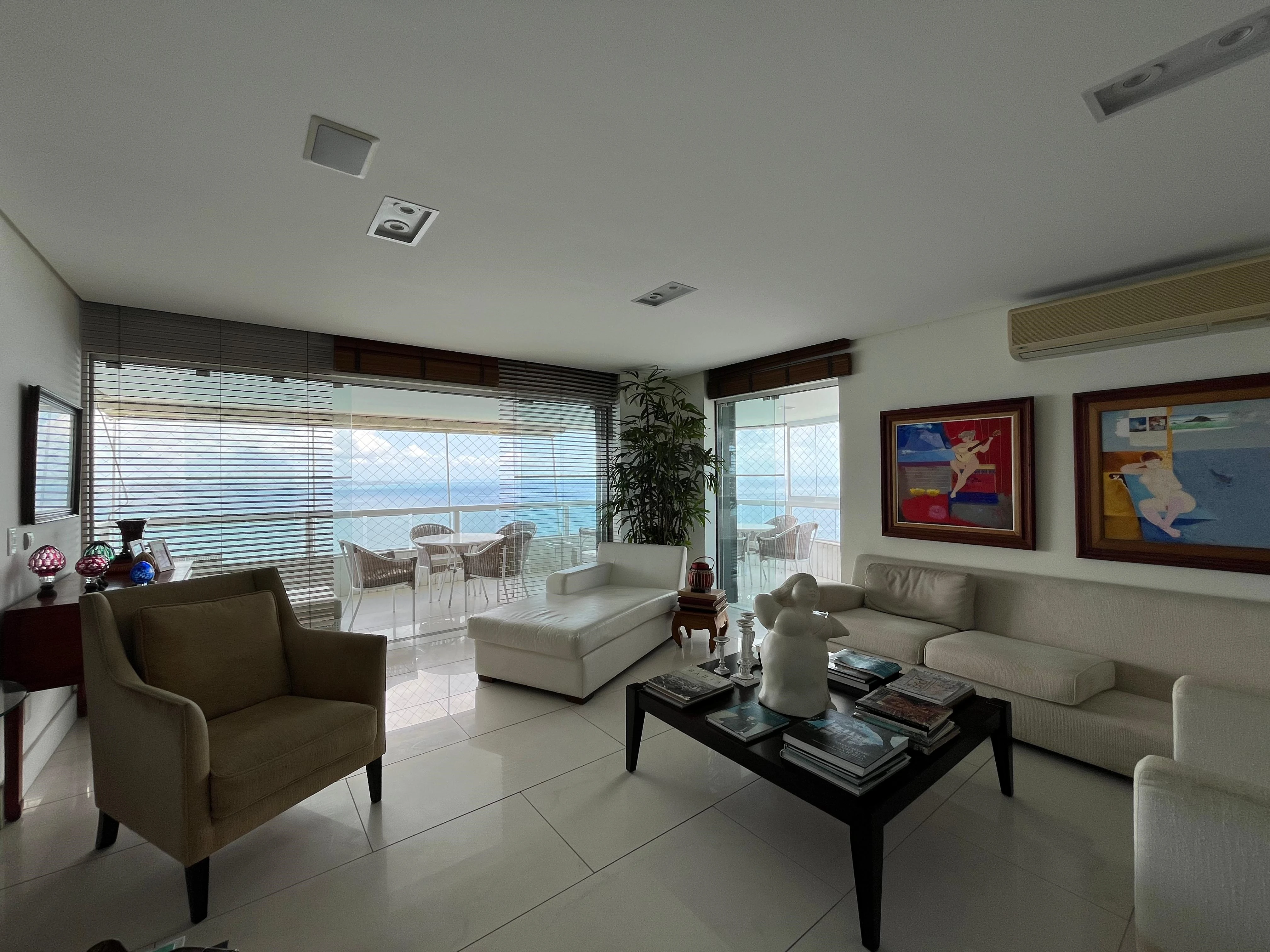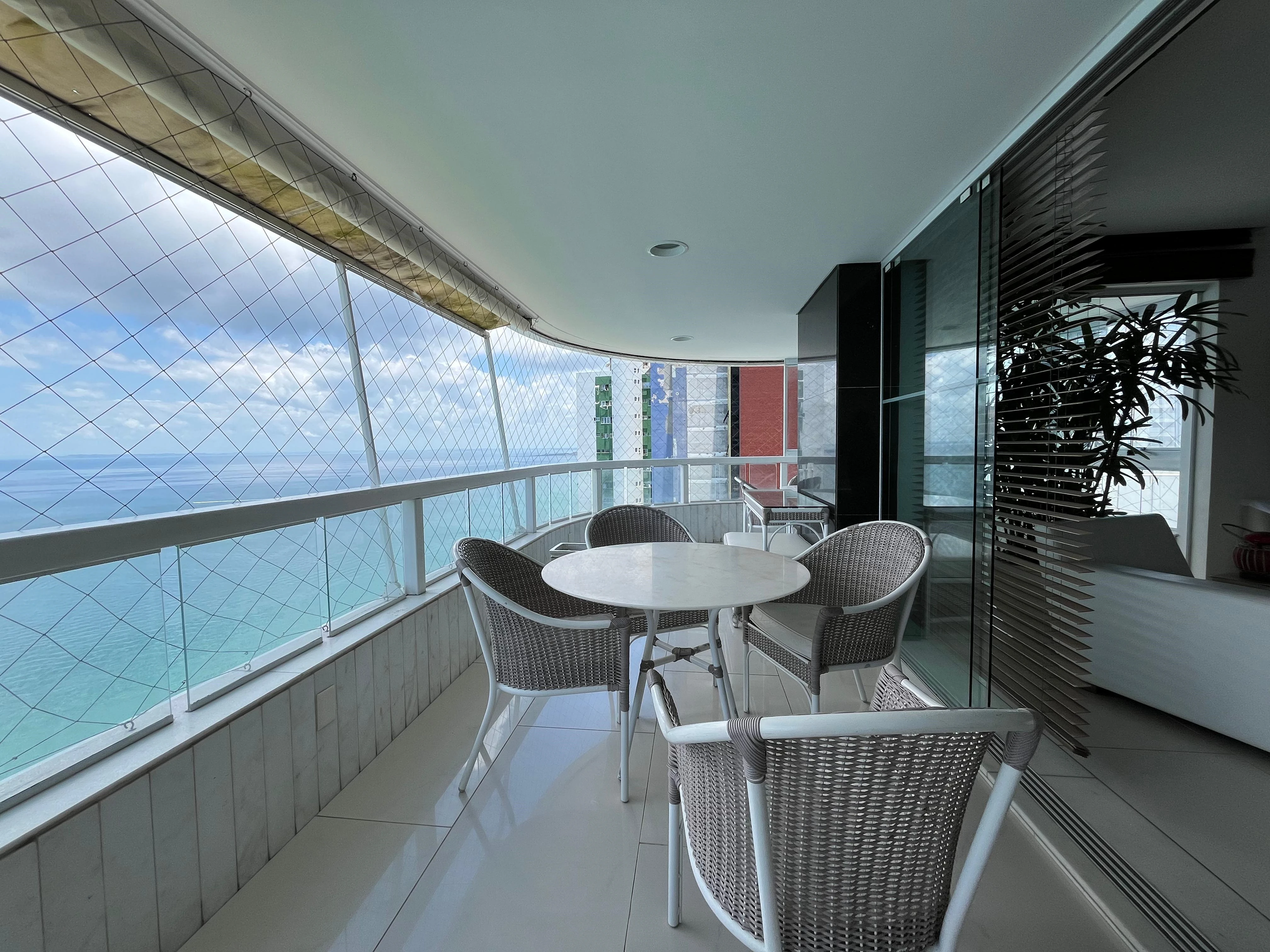 Apartamento com três suítes vista mar à venda no Corredor da Vitória. Com 278m², o apartamento possui uma ampla varanda com vista panorâmica para a Baia de Todos os Santos, sala de estar e sala de jantar, home theater, lavabo, cozinha, área de serviço, dois quartos e um banheiro de serviço. Andar alto e quatro vagas de garagem.