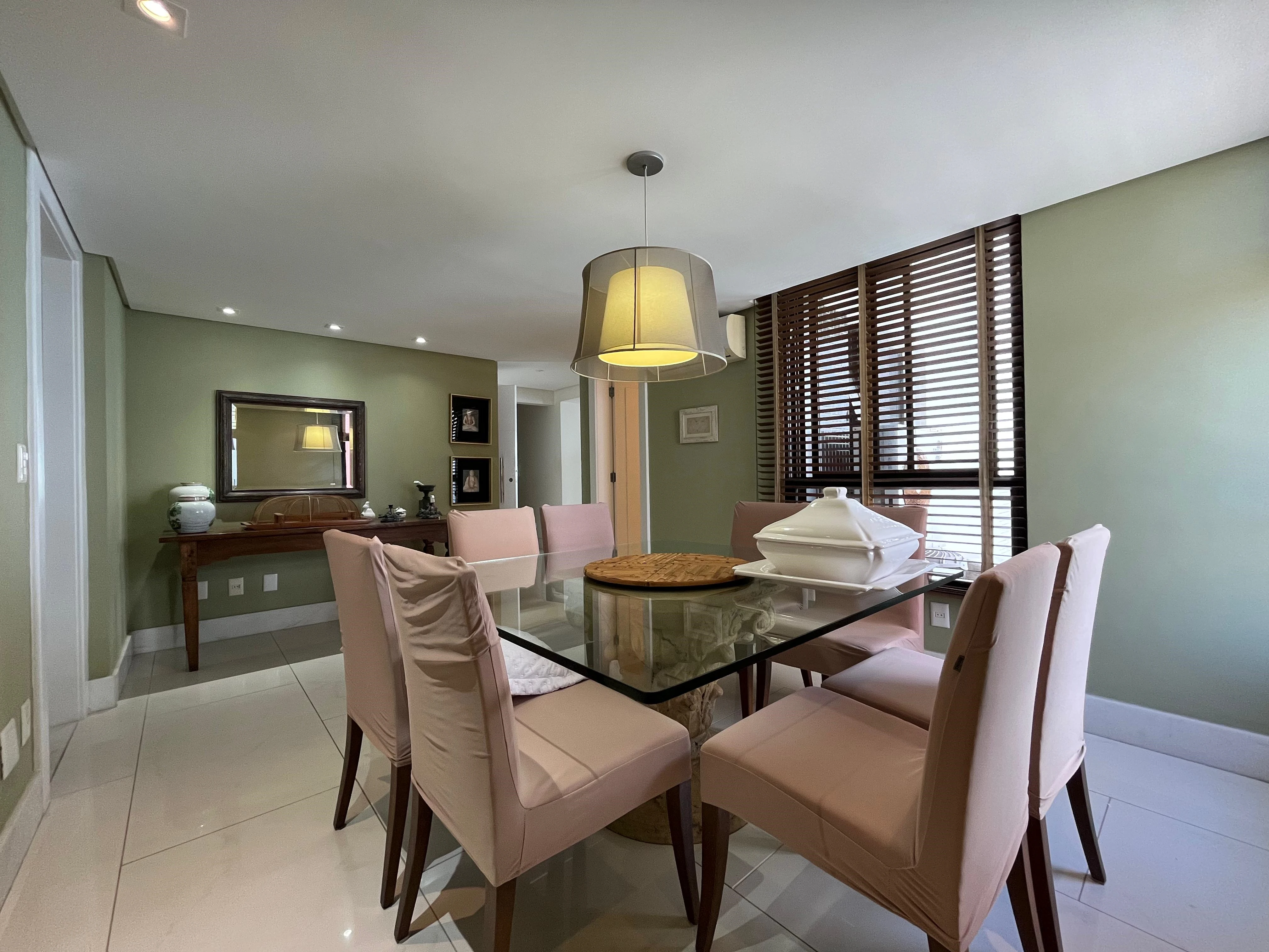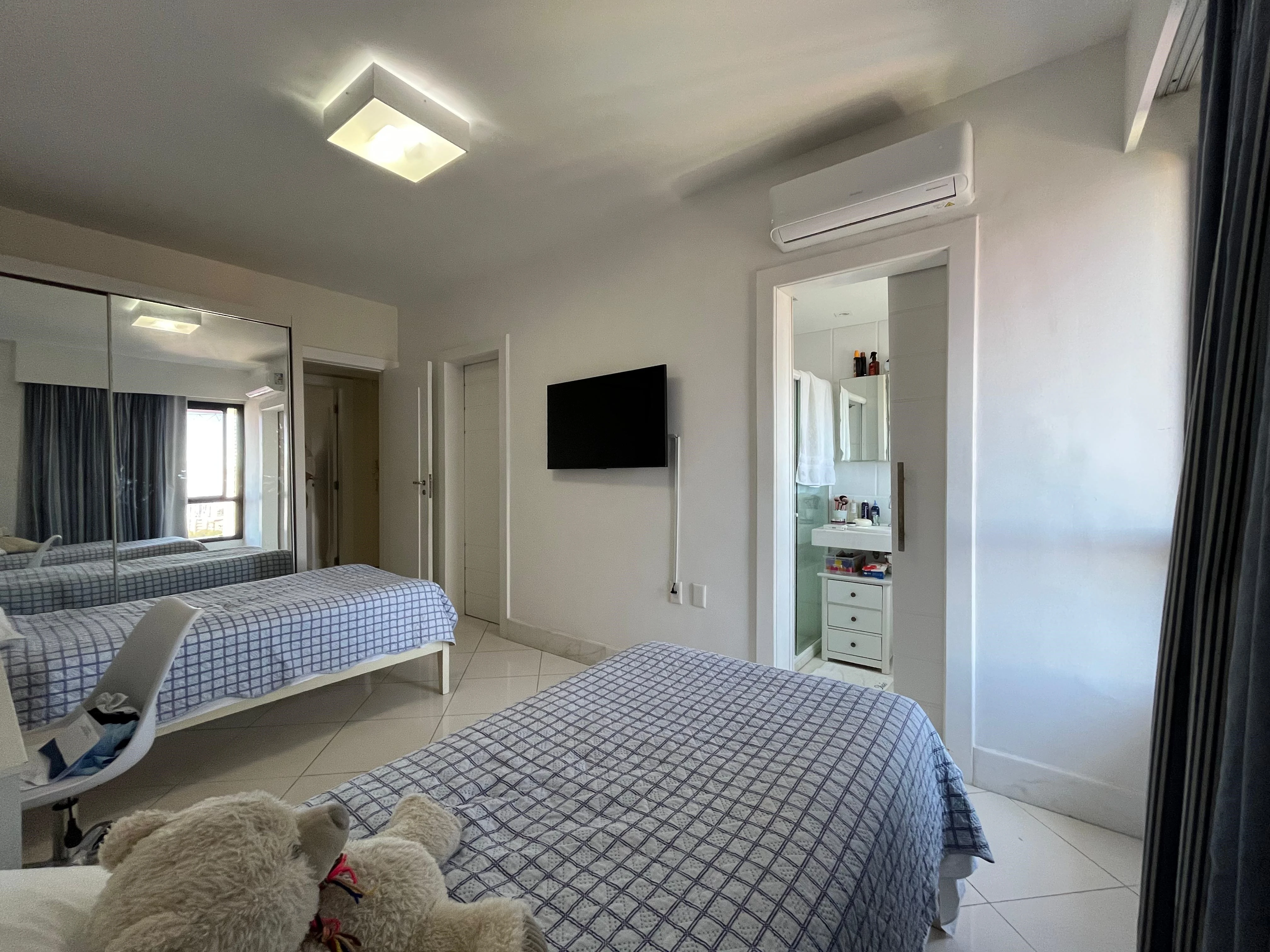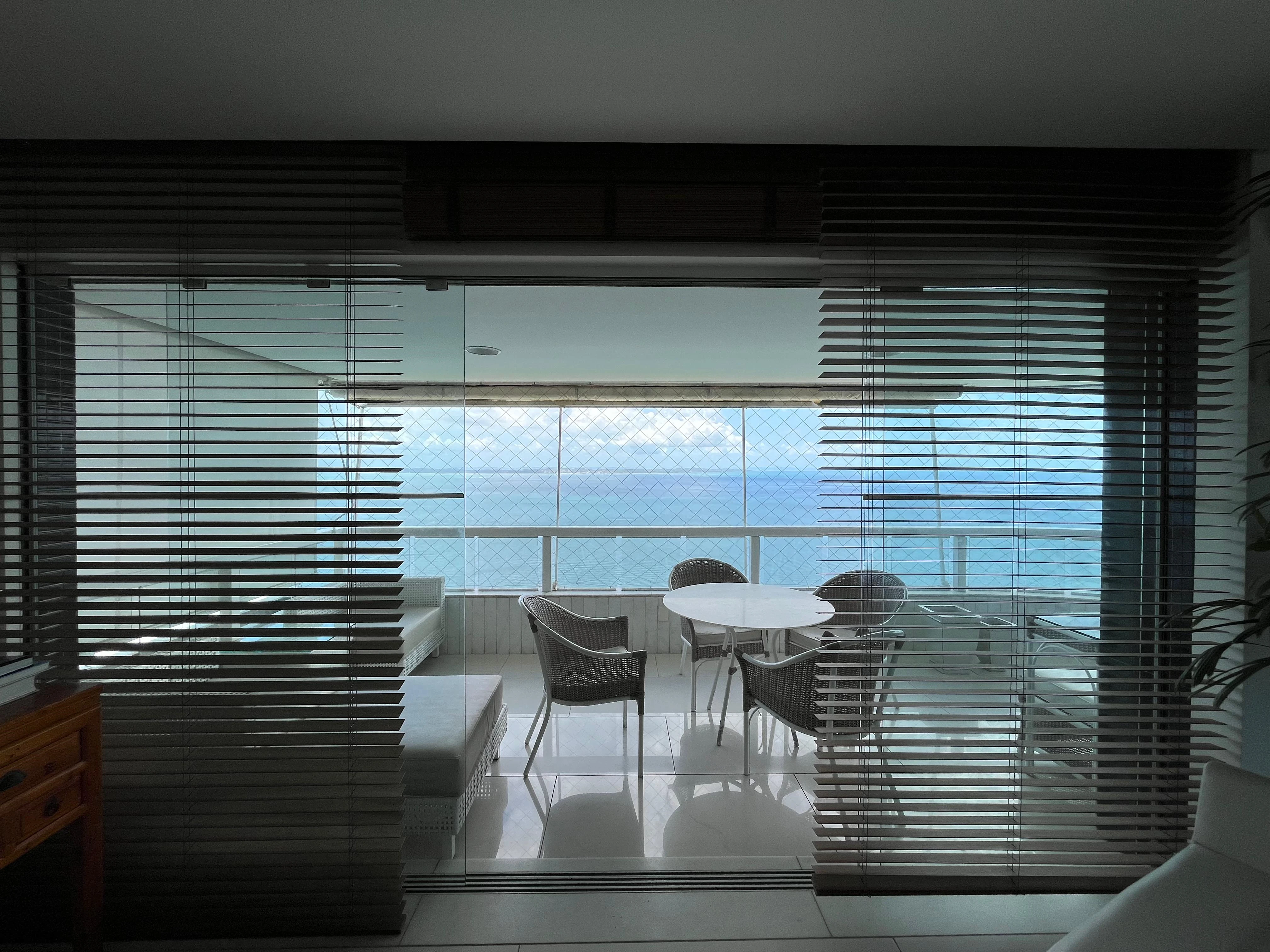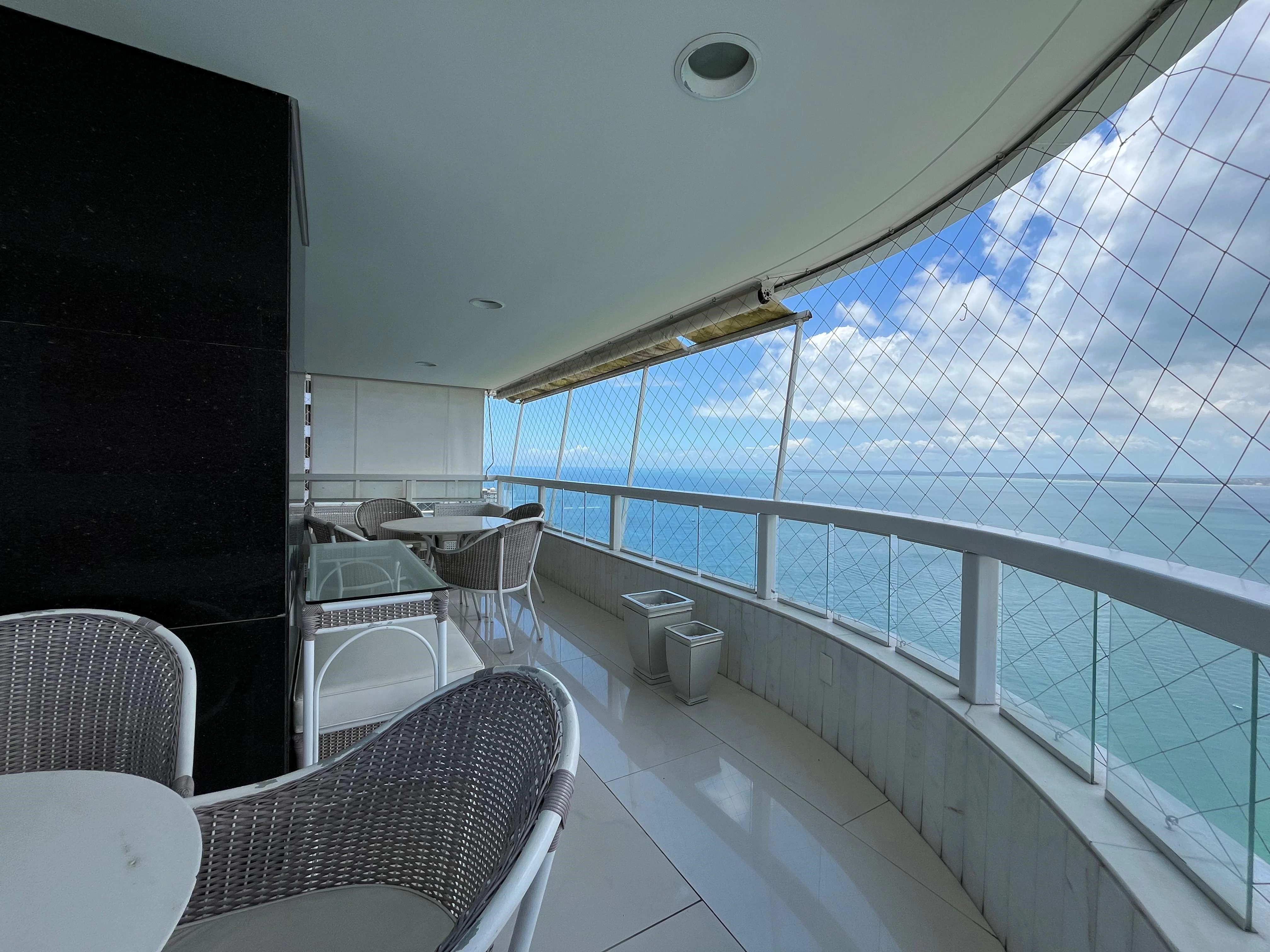 Apartamento com três suítes vista mar à venda no Corredor da Vitória. Com 278m², o apartamento possui uma ampla varanda com vista panorâmica para a Baia de Todos os Santos, sala de estar e sala de jantar, home theater, lavabo, cozinha, área de serviço, dois quartos e um banheiro de serviço. Andar alto e quatro vagas de garagem.