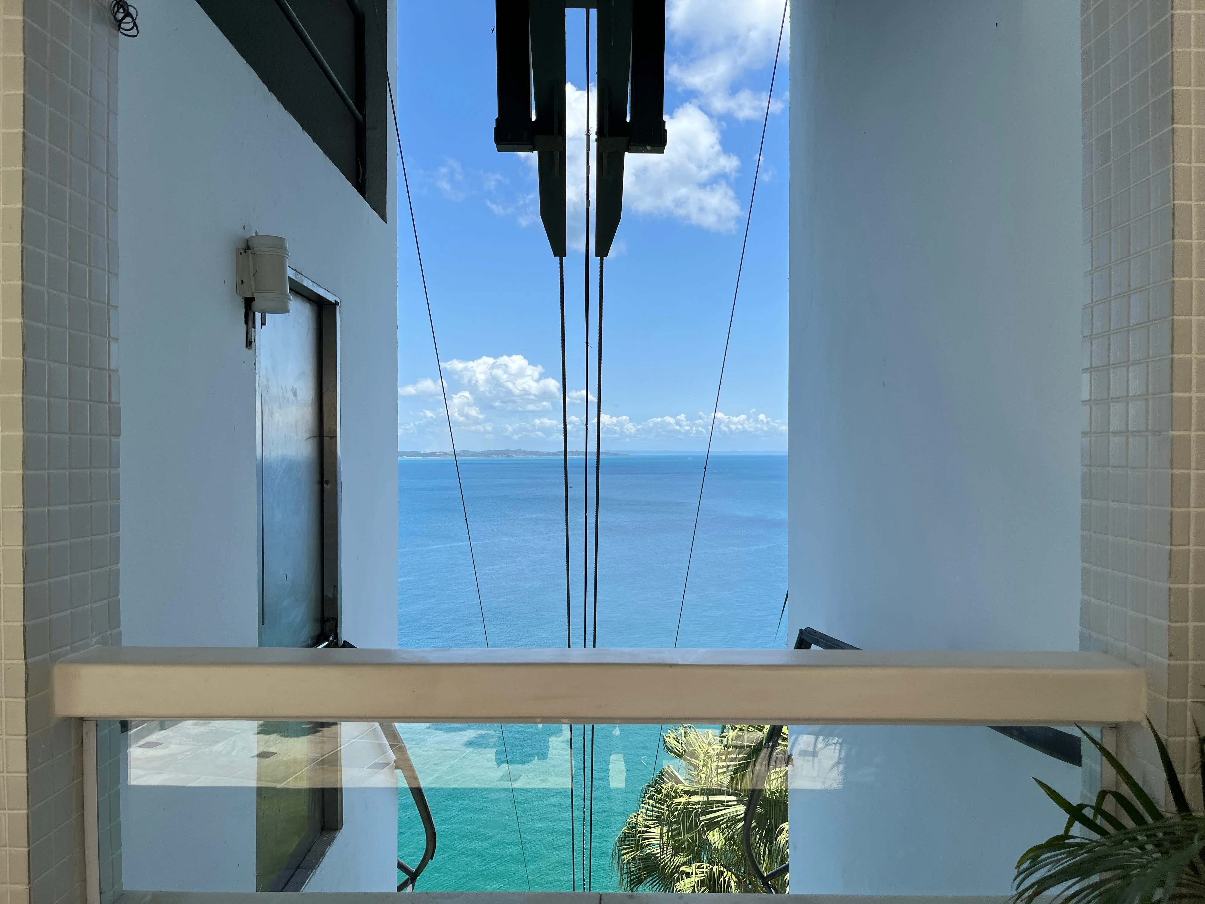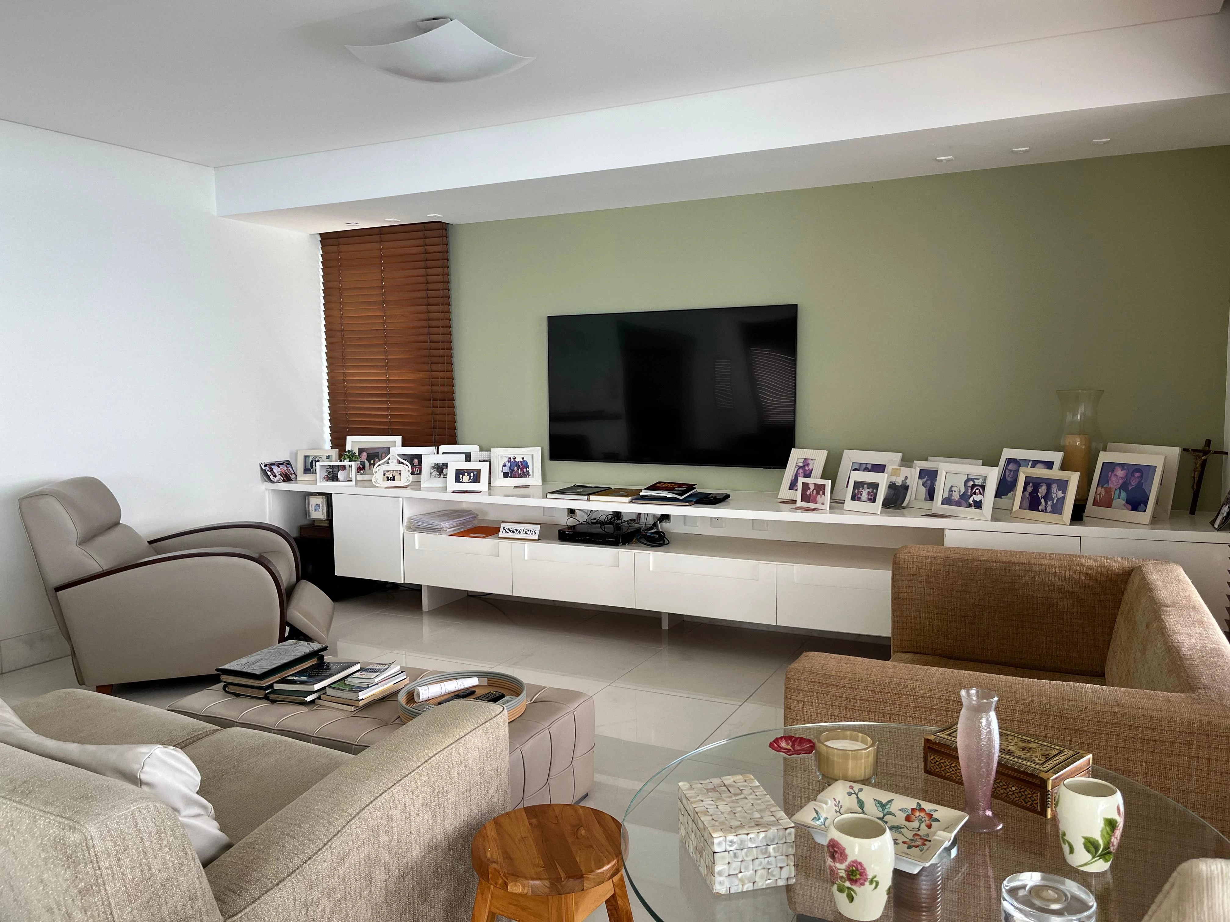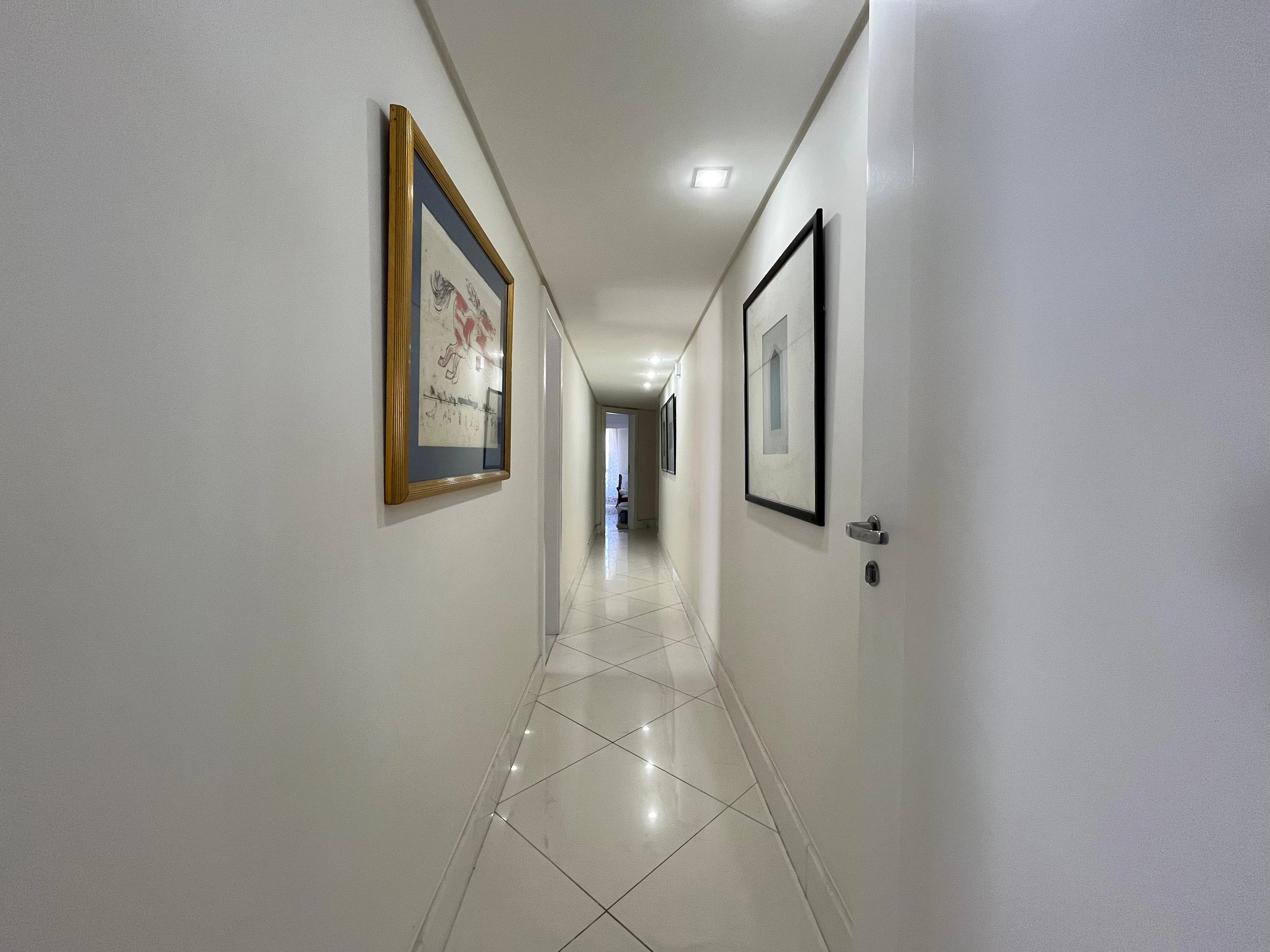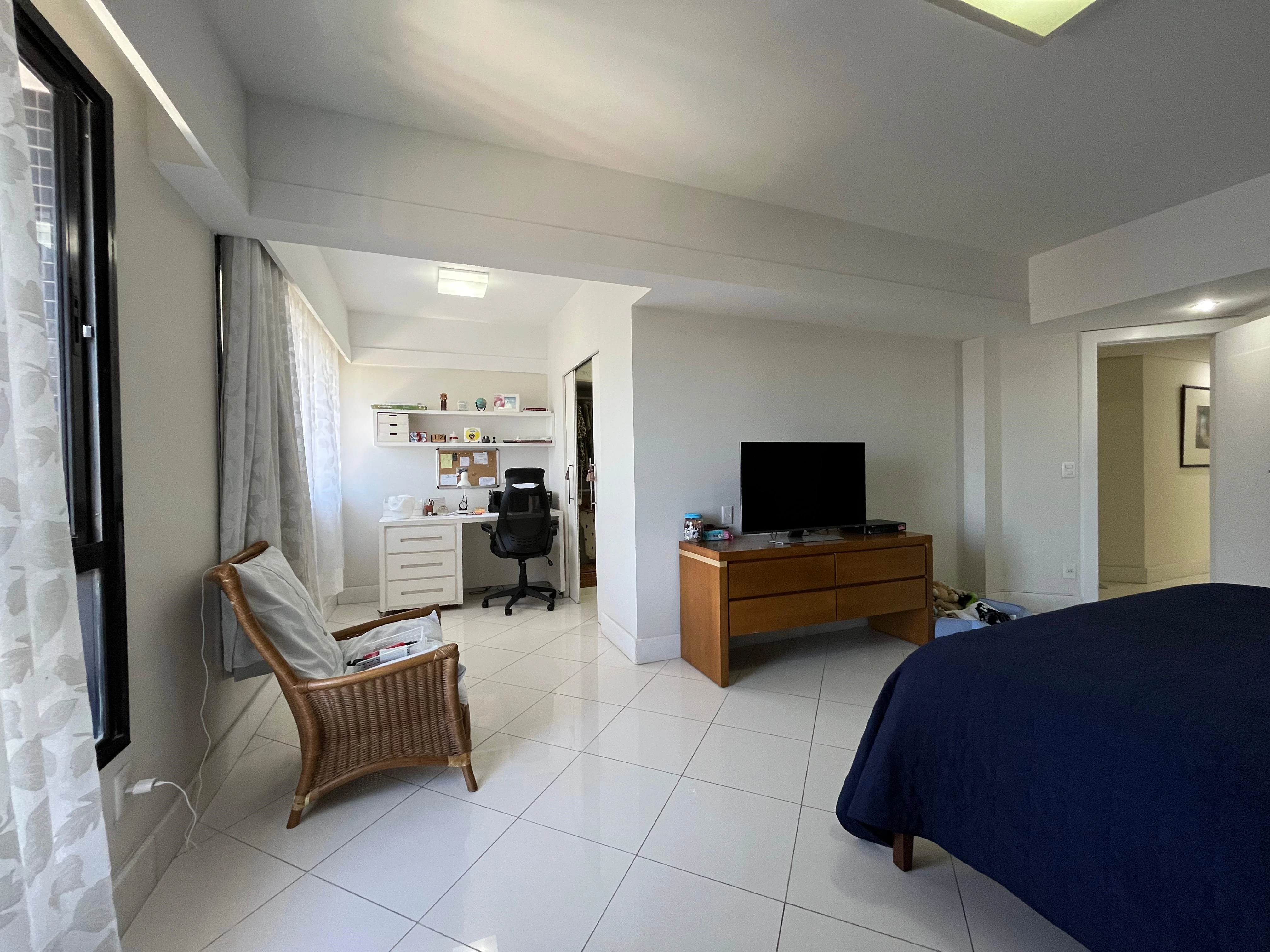 Apartamento com três suítes vista mar à venda no Corredor da Vitória. Com 278m², o apartamento possui uma ampla varanda com vista panorâmica para a Baia de Todos os Santos, sala de estar e sala de jantar, home theater, lavabo, cozinha, área de serviço, dois quartos e um banheiro de serviço. Andar alto e quatro vagas de garagem.