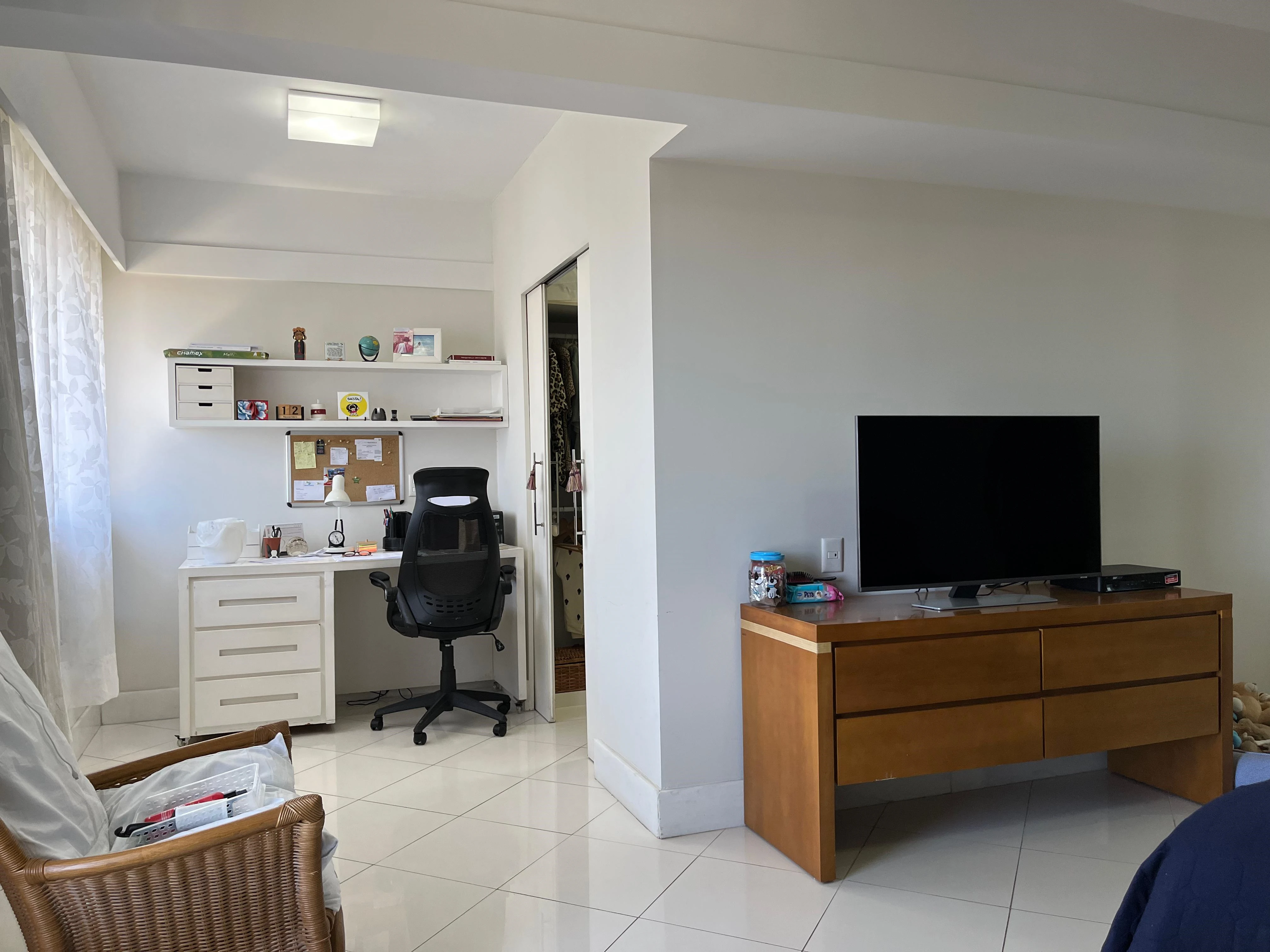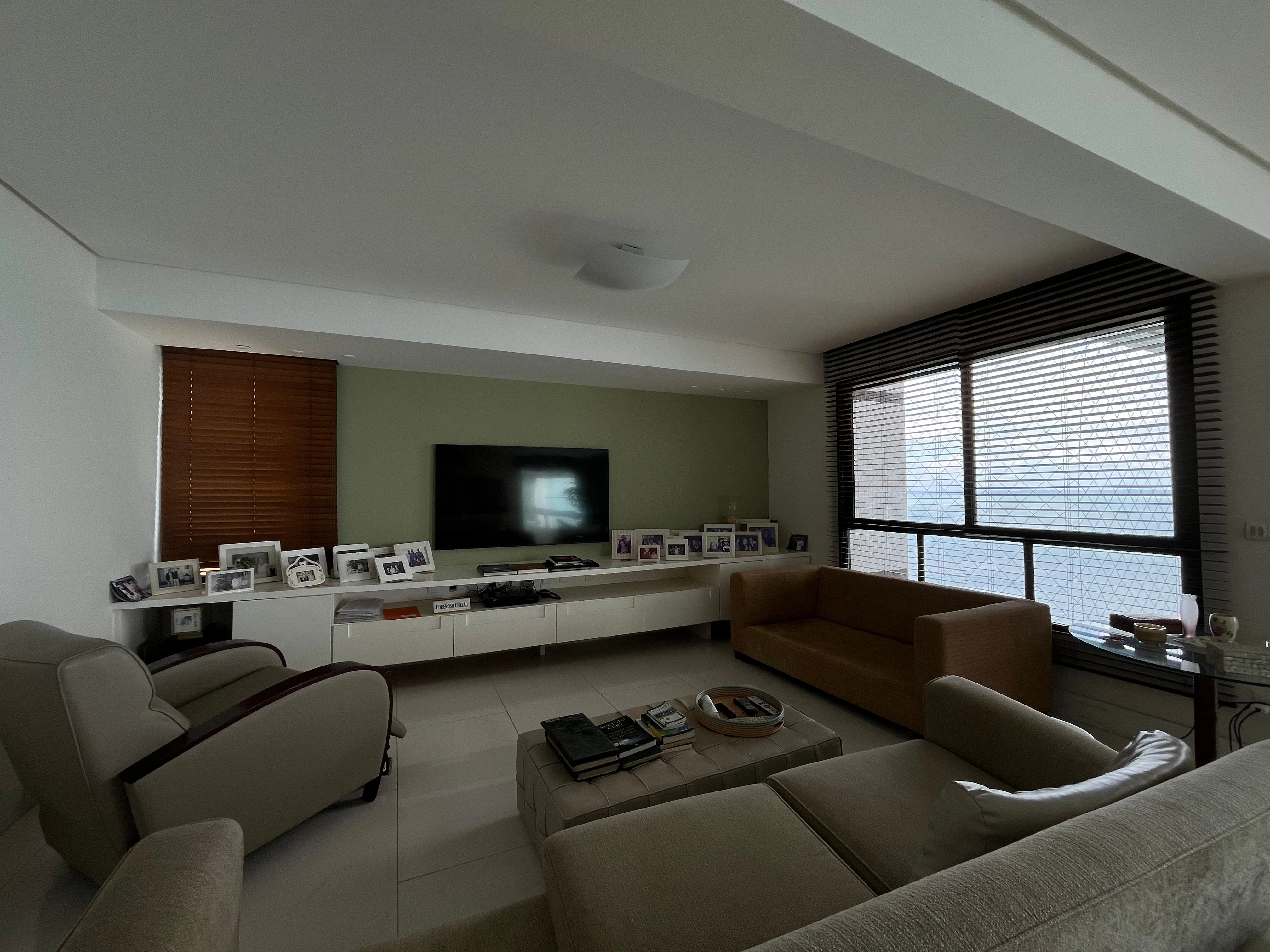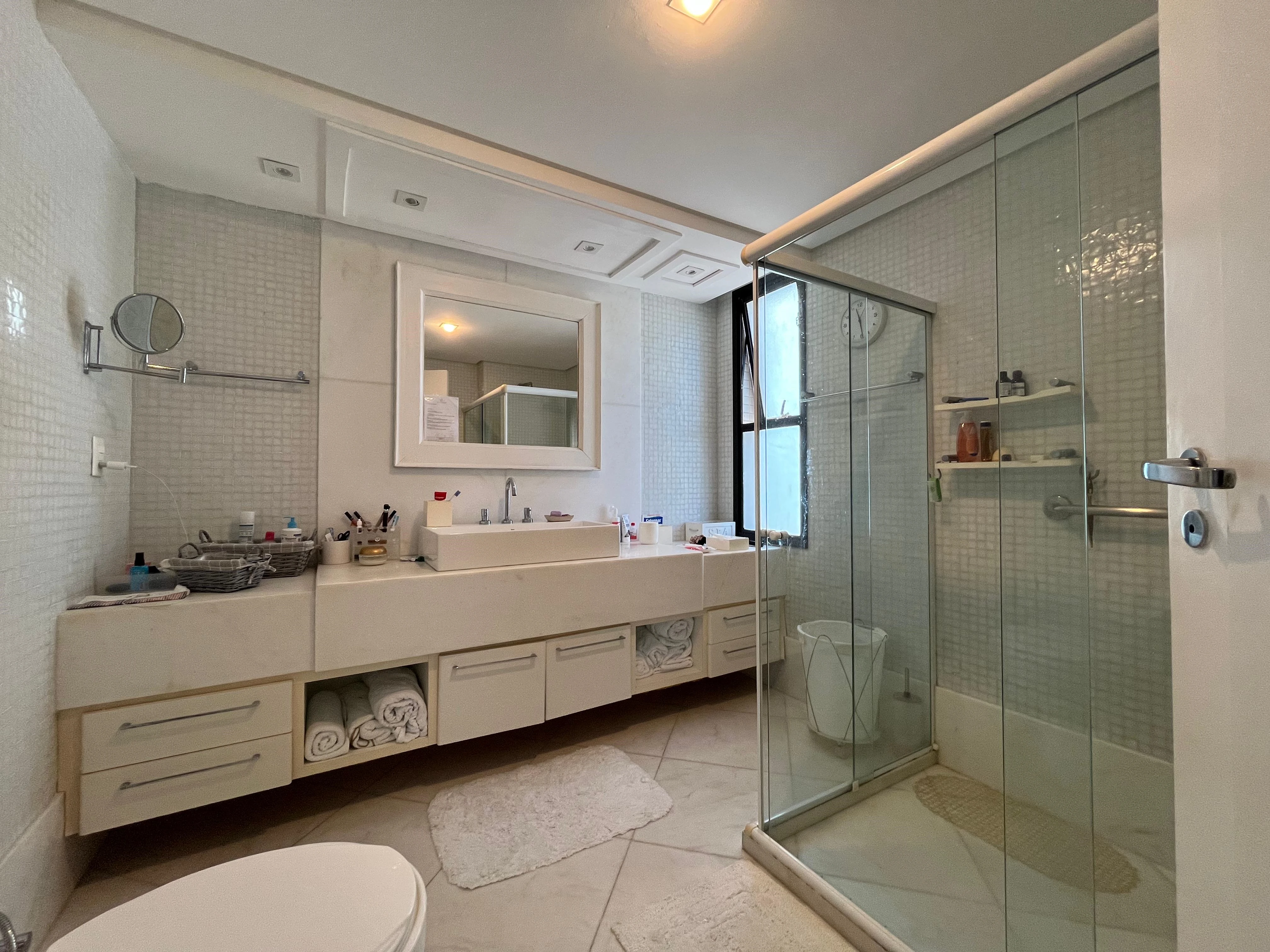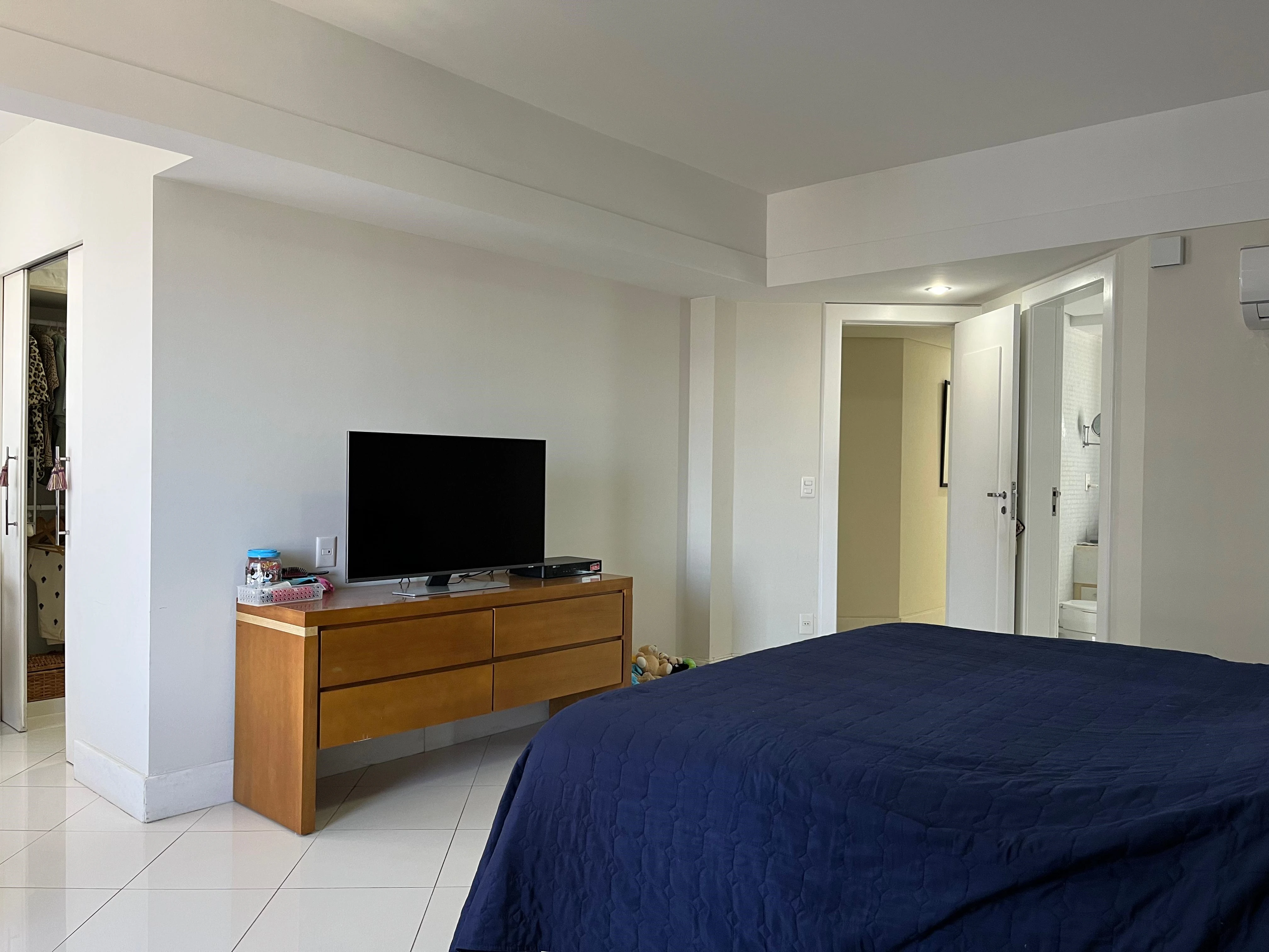 Apartamento com três suítes vista mar à venda no Corredor da Vitória. Com 278m², o apartamento possui uma ampla varanda com vista panorâmica para a Baia de Todos os Santos, sala de estar e sala de jantar, home theater, lavabo, cozinha, área de serviço, dois quartos e um banheiro de serviço. Andar alto e quatro vagas de garagem.