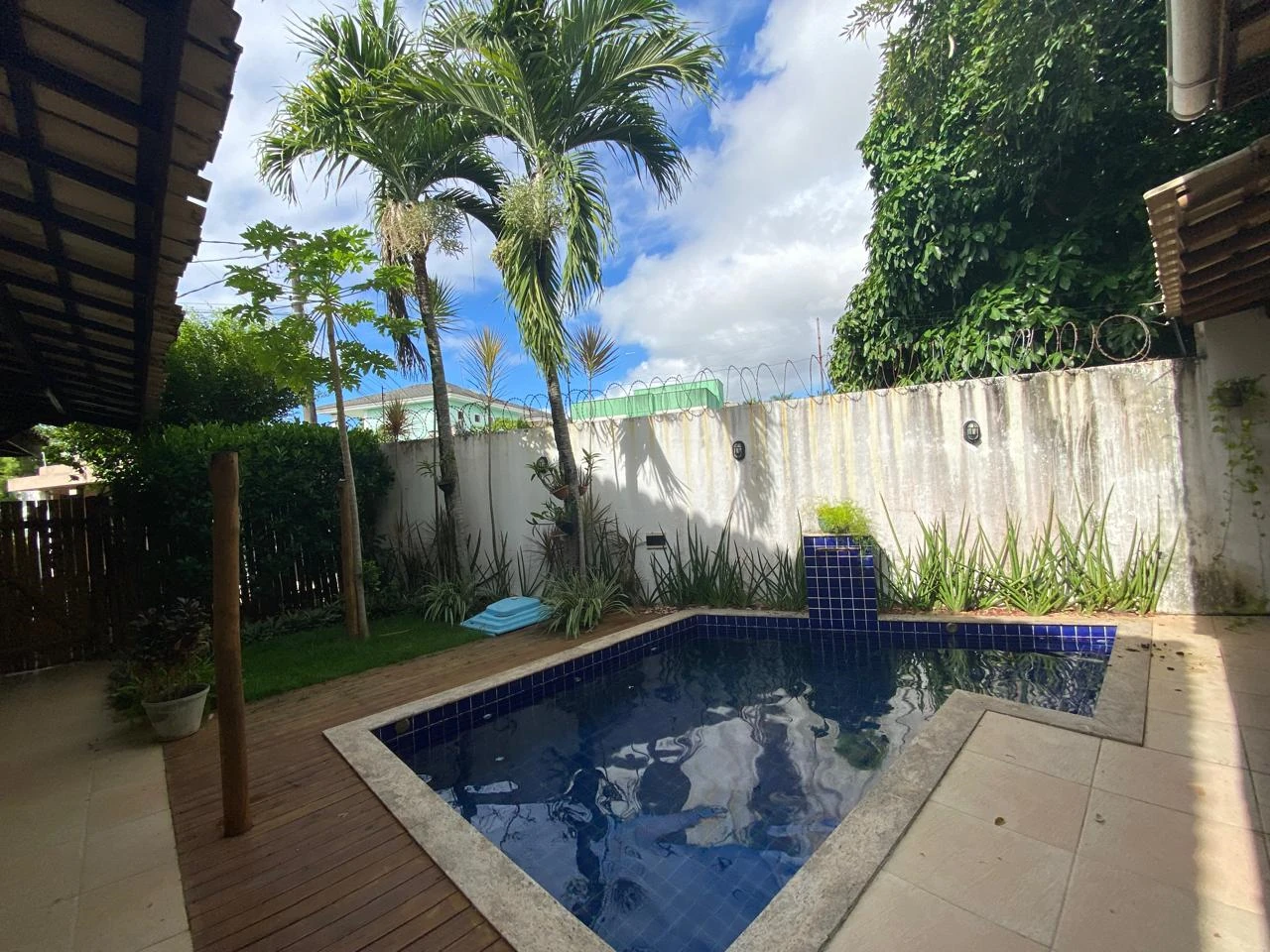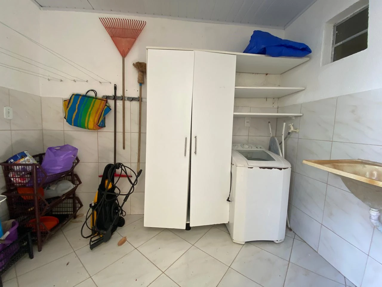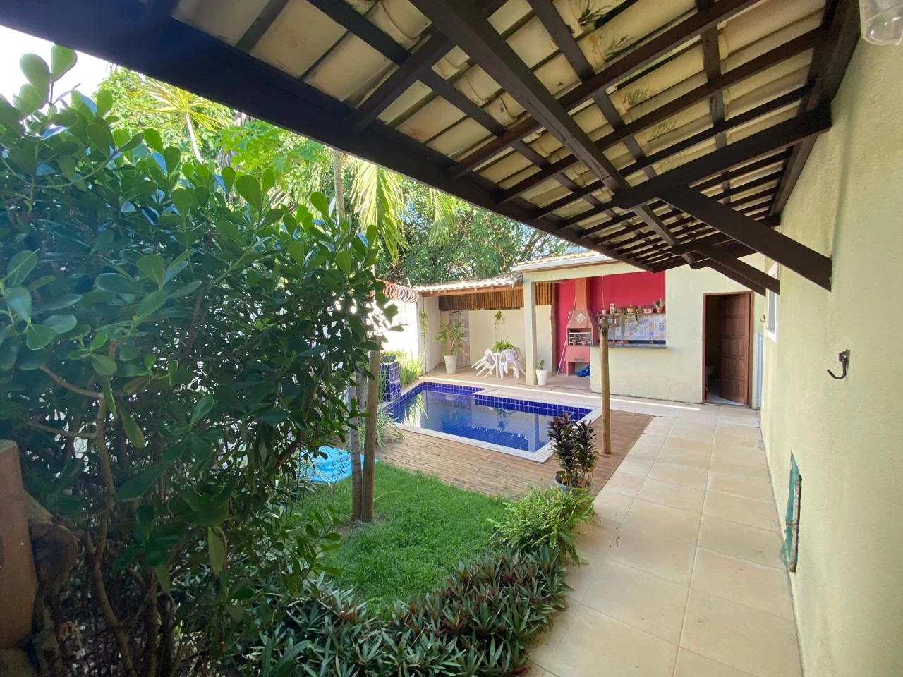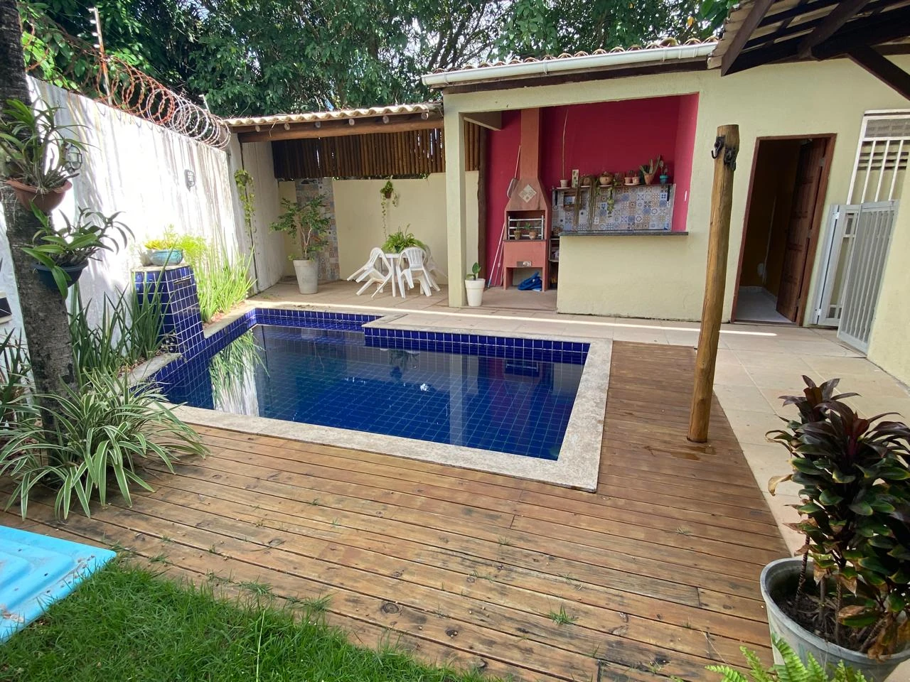Área externa com piscina, churasqueira, quiosque, garagem coberta para 2 carros, lavanderia e dependência completa.