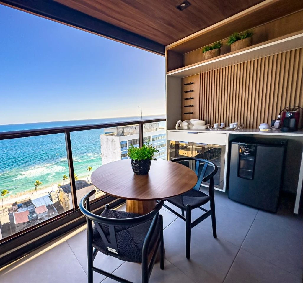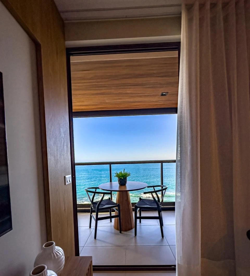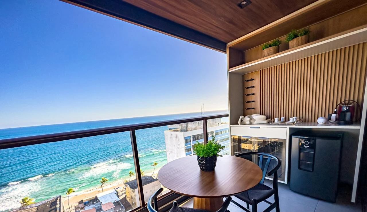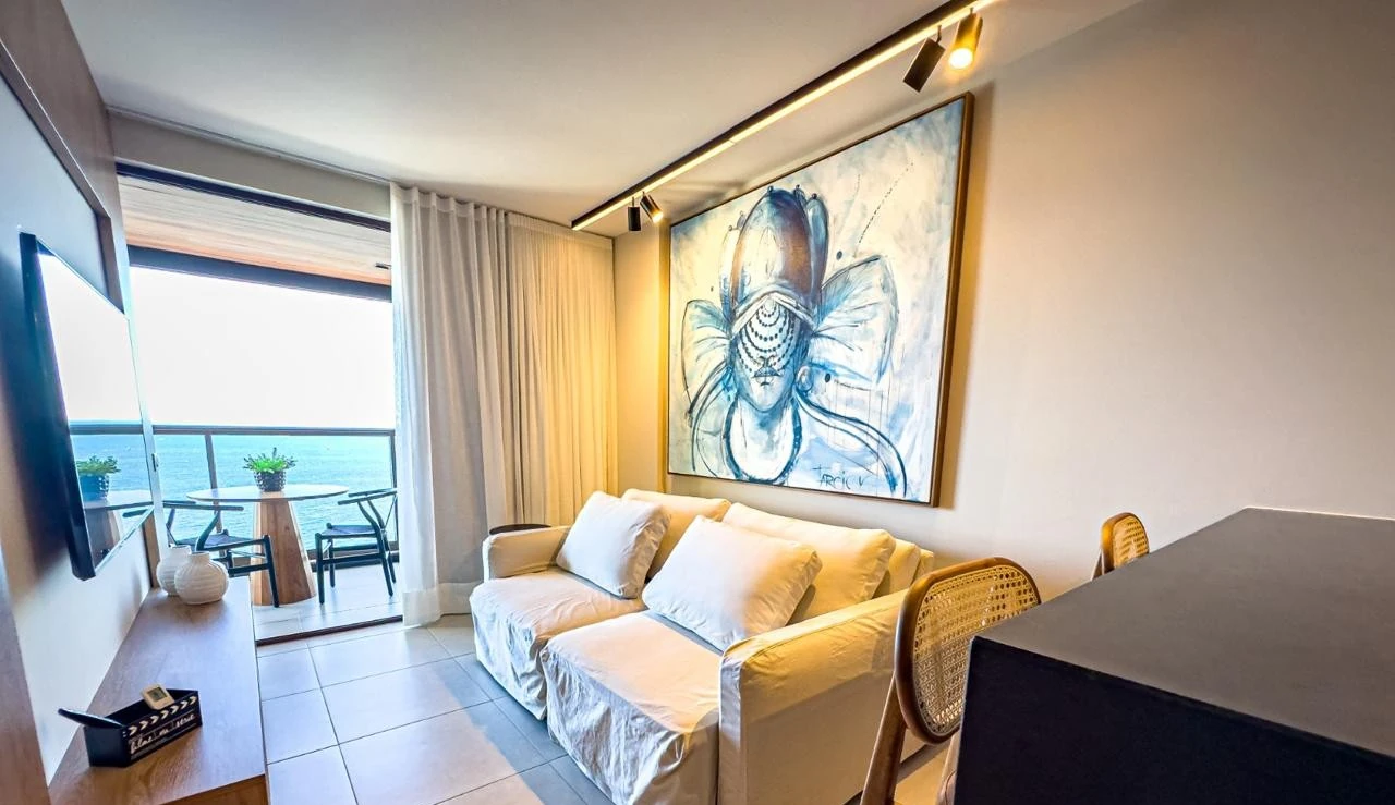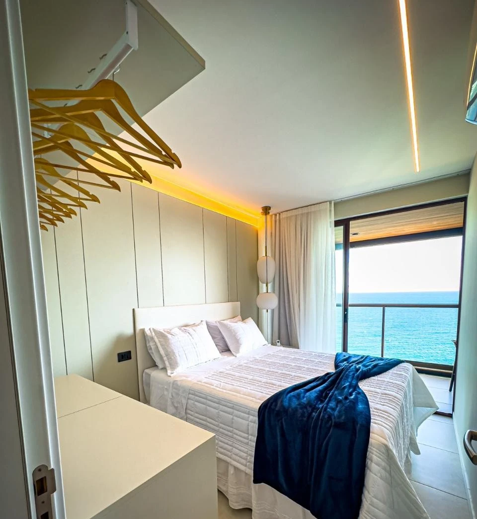 Apartamento quarto e sala à venda no Nau Barra, com vista Mar Frontal, 44m². O imóvel conta com uma suíte aconchegante, sala integrada à varanda com vista panorâmica para o mar e cozinha planejada. Todos os ambientes possuem armários de alto padrão. Para sua total comodidade, o apartamento dispõe de uma vaga de garagem fixa.