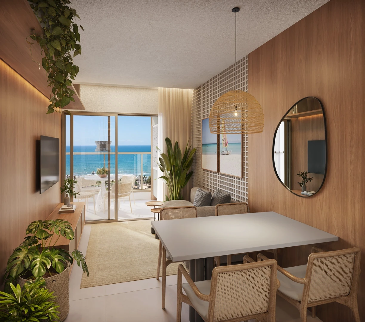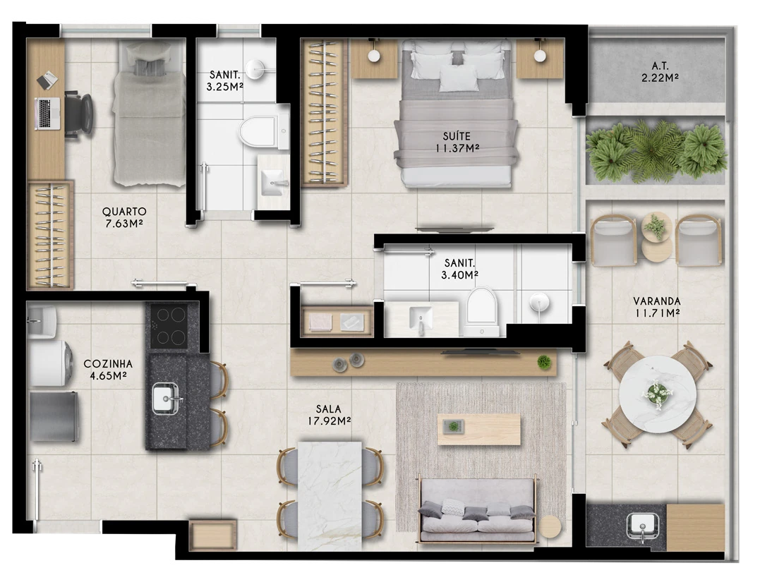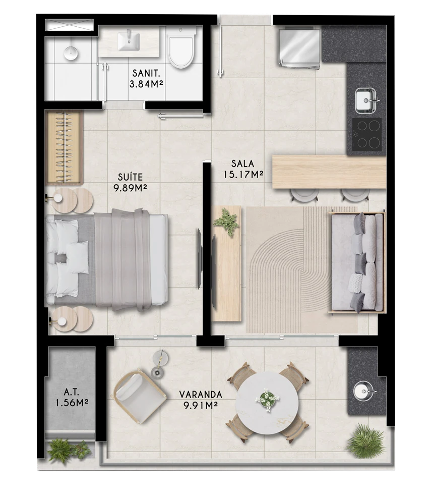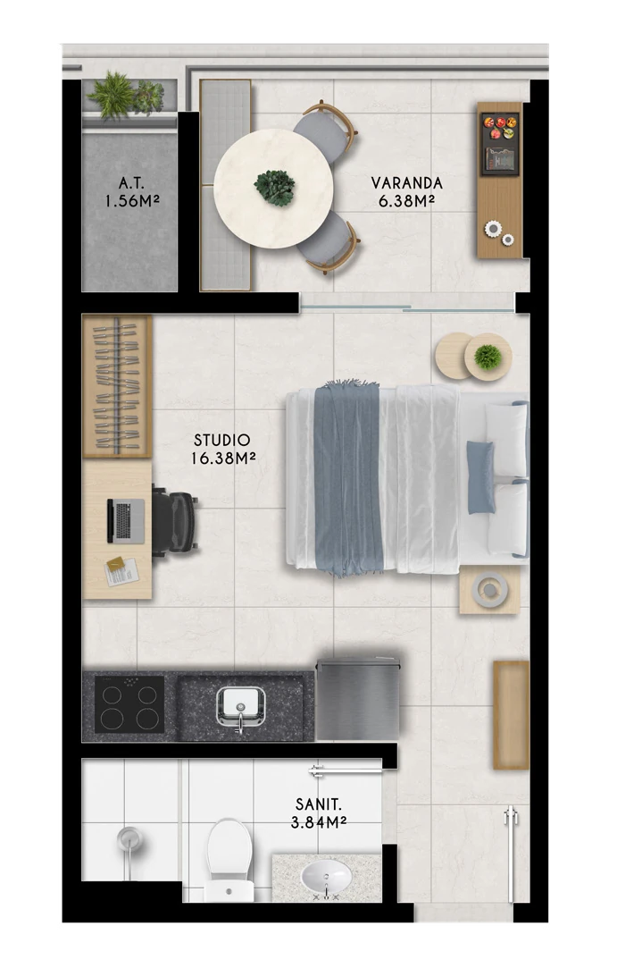 Ilha de Lanai oferece três tipologias de apartamentos, pensadas para atender desde quem busca praticidade até quem precisa de mais espaço. São studios de 28,1 m², apartamentos de quarto e sala com 40,3 m² e unidades de 2 quartos com suíte de 62,1 m². Todas as unidades possuem varanda, garantindo uma conexão permanente com a paisagem e a brisa do mar. Com 70 studios, 70 apartamentos de quarto e sala e 28 unidades de 2 quartos, o empreendimento atende tanto ao comprador que busca moradia quanto ao investidor que deseja rentabilizar com locação.
