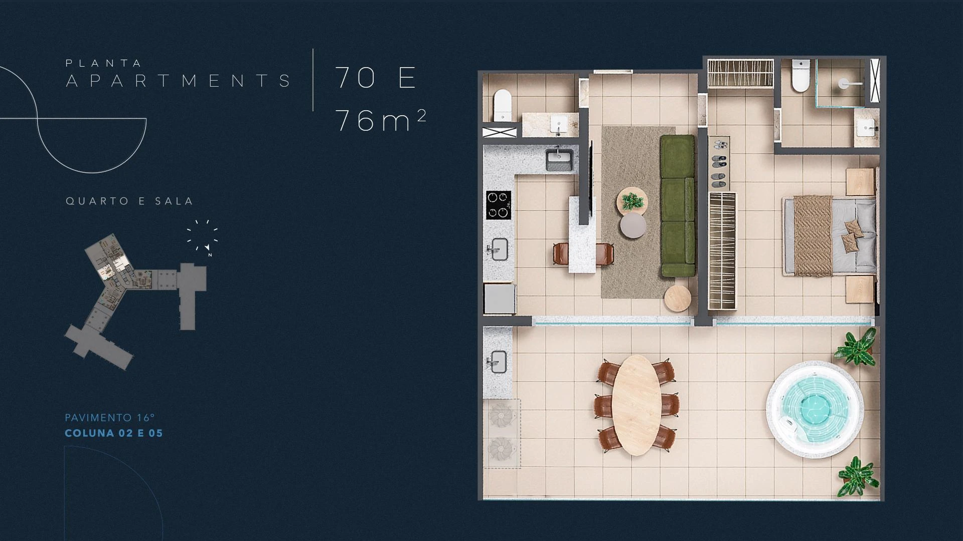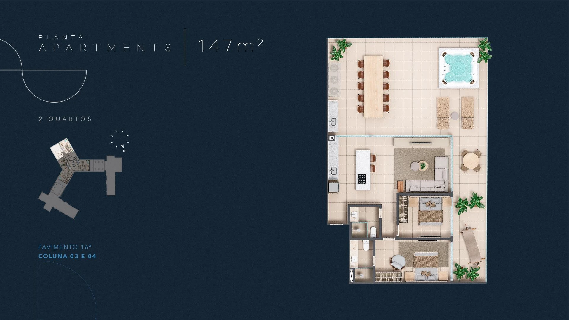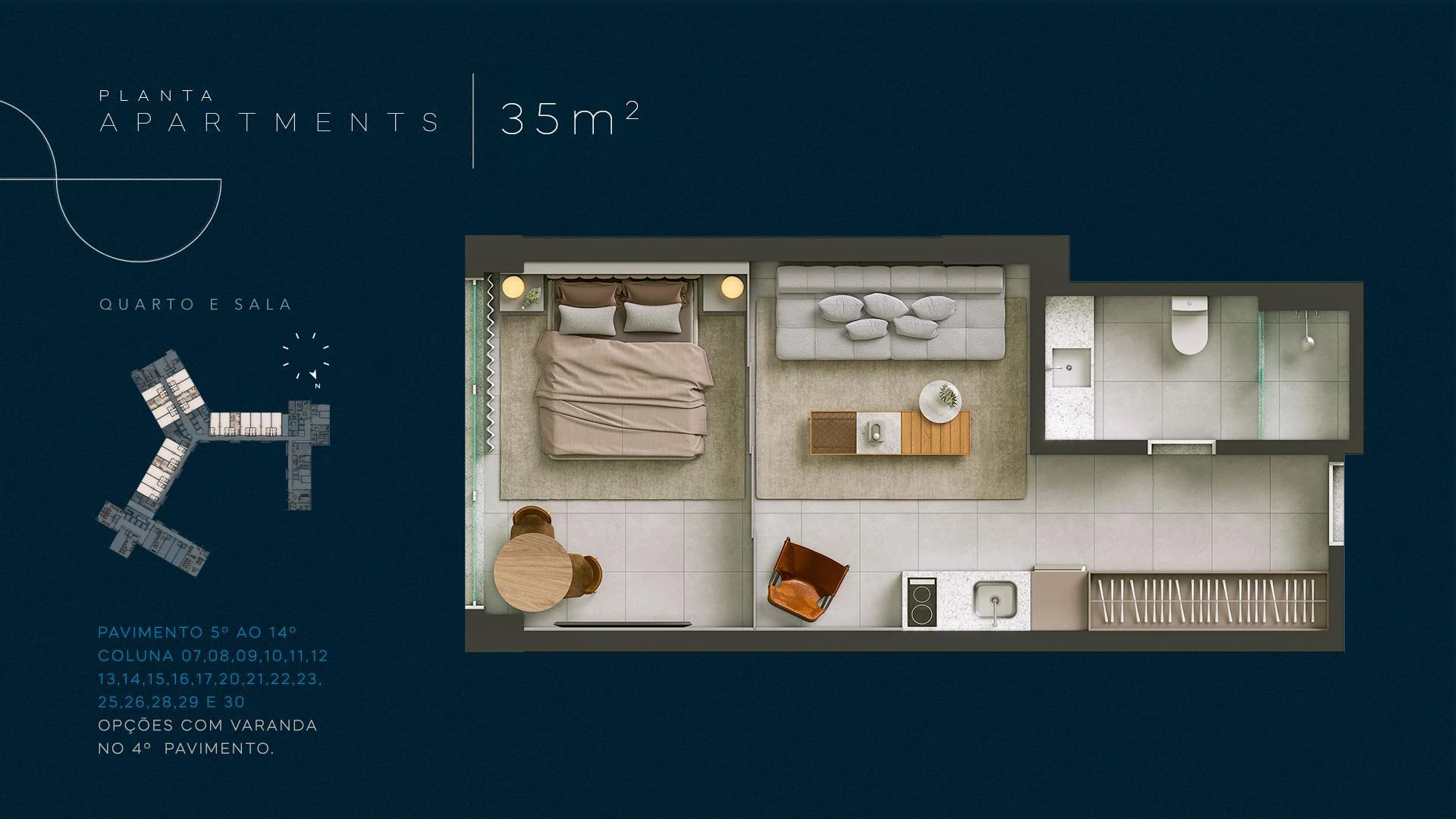 Infinity Apartments oferece unidades a partir de 35 m², com opções de quarto e sala integrados, dois quartos e coberturas que chegam a 204 m², todas projetadas com amplas esquadrias que enquadram o mar como elemento central da decoração. Nos andares superiores, apartamentos presidenciais e de cobertura entregam privacidade, amplitude e acabamento diferenciado, com opções de varanda e jacuzzi privativa.