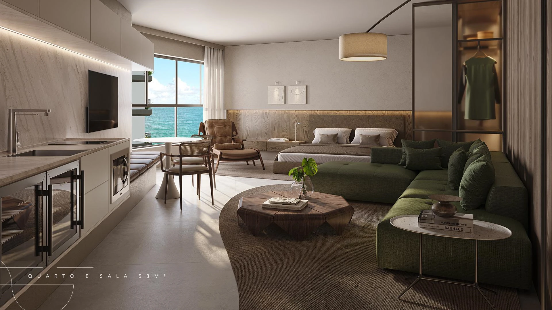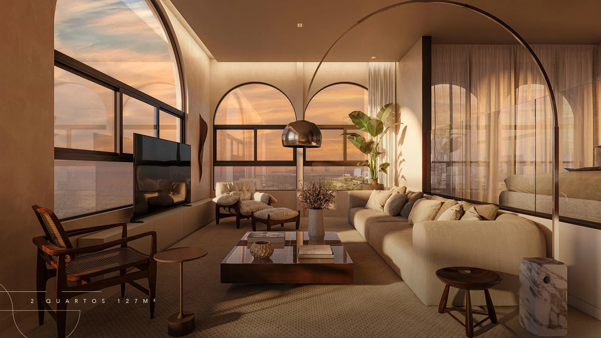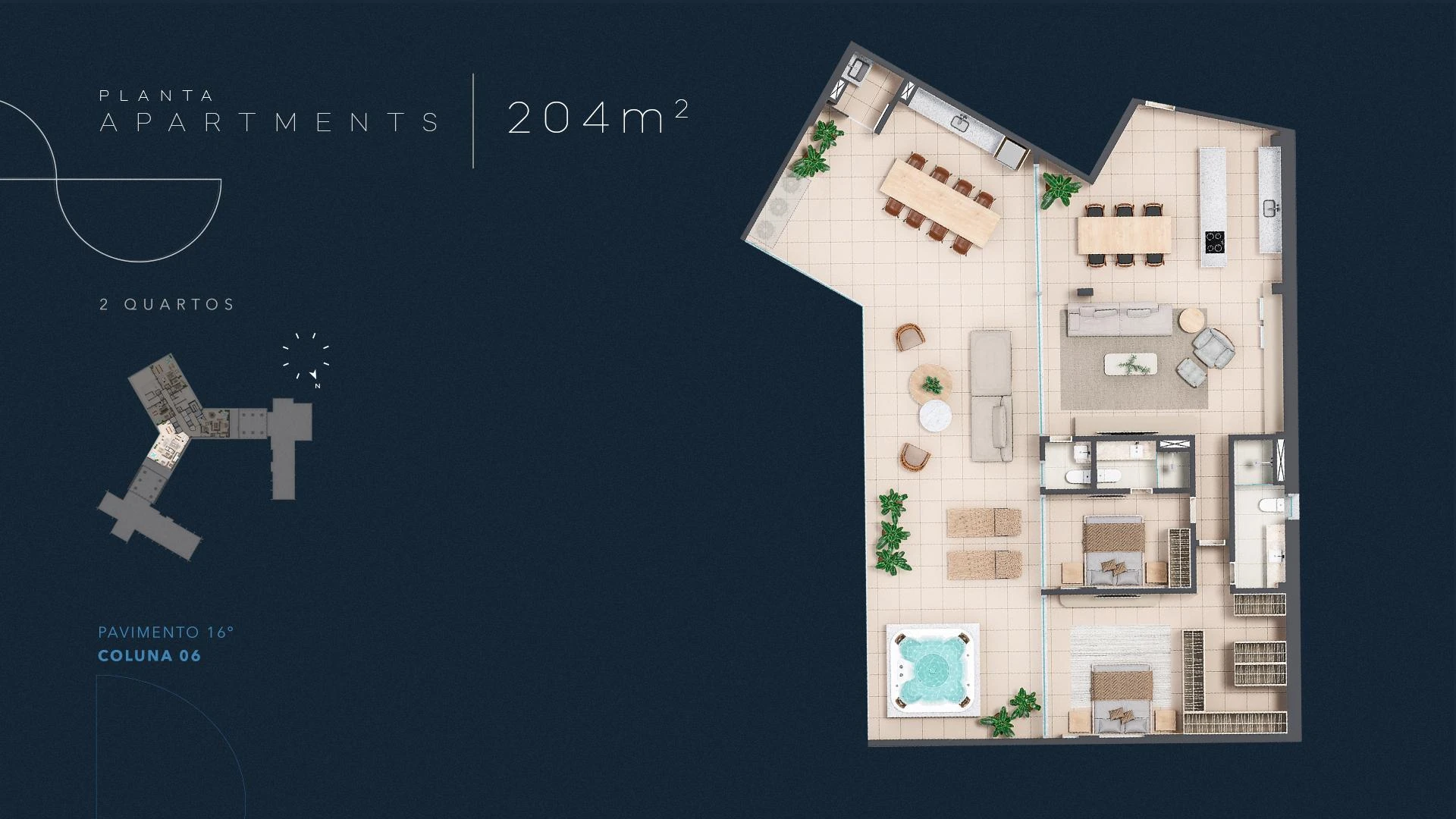 Infinity Apartments oferece unidades a partir de 35 m², com opções de quarto e sala integrados, dois quartos e coberturas que chegam a 204 m², todas projetadas com amplas esquadrias que enquadram o mar como elemento central da decoração. Nos andares superiores, apartamentos presidenciais e de cobertura entregam privacidade, amplitude e acabamento diferenciado, com opções de varanda e jacuzzi privativa.