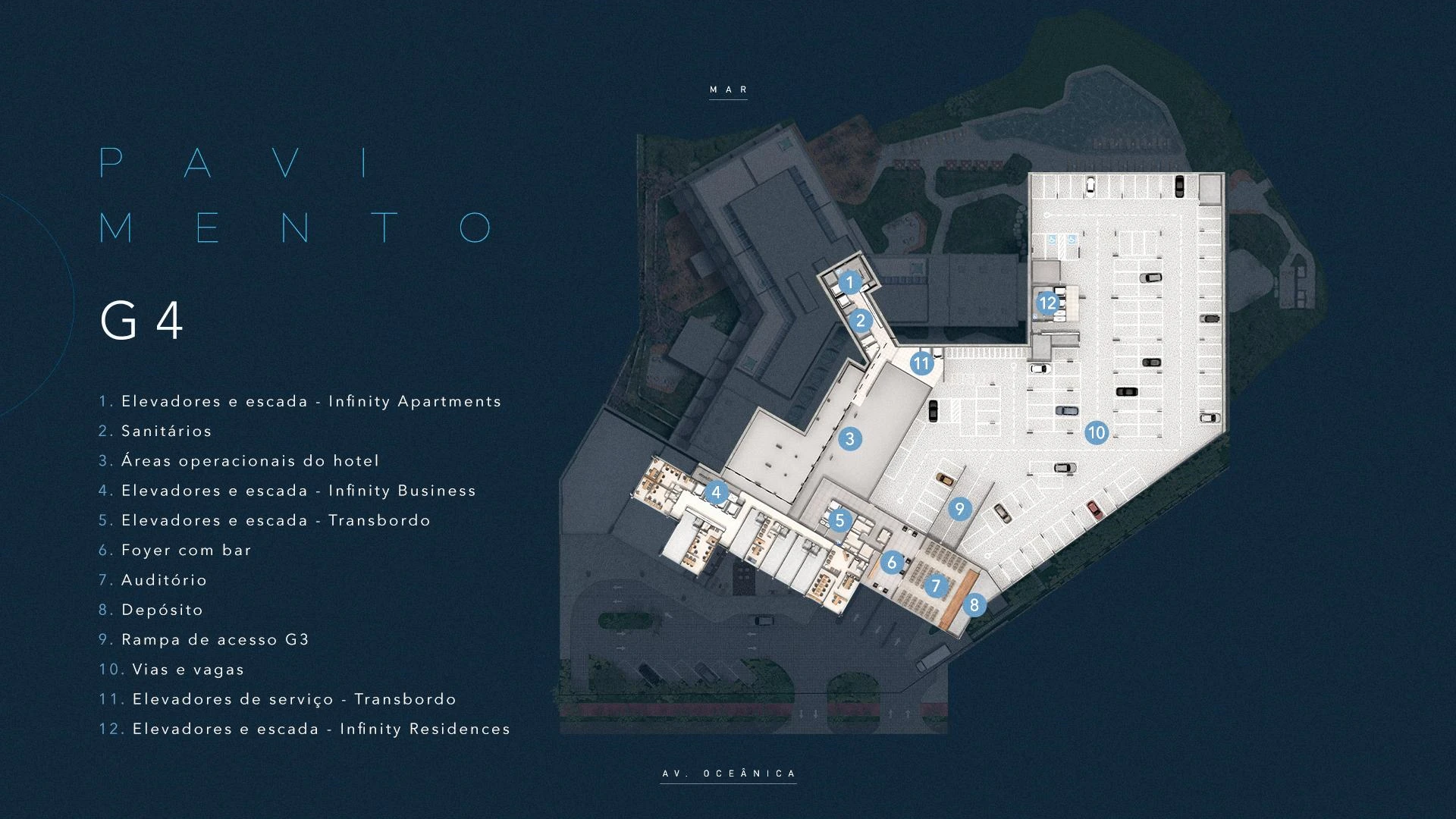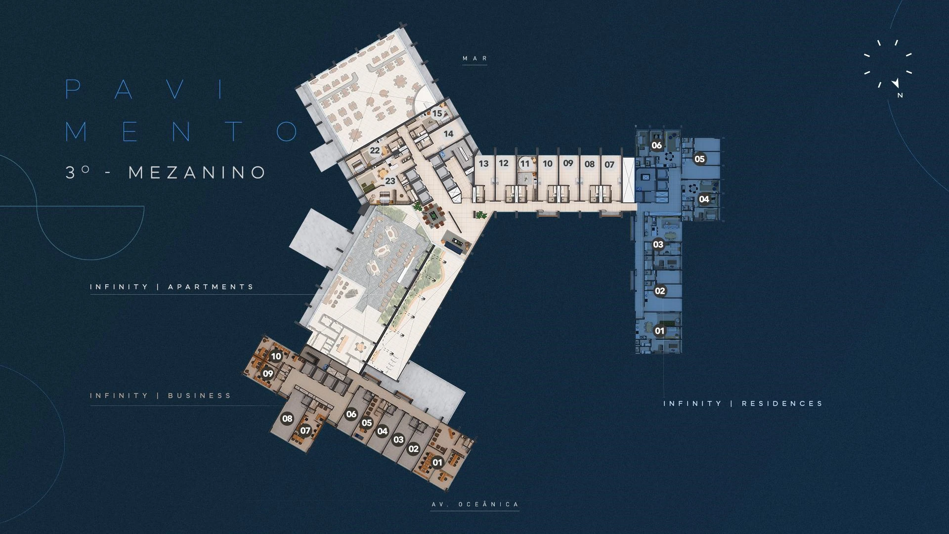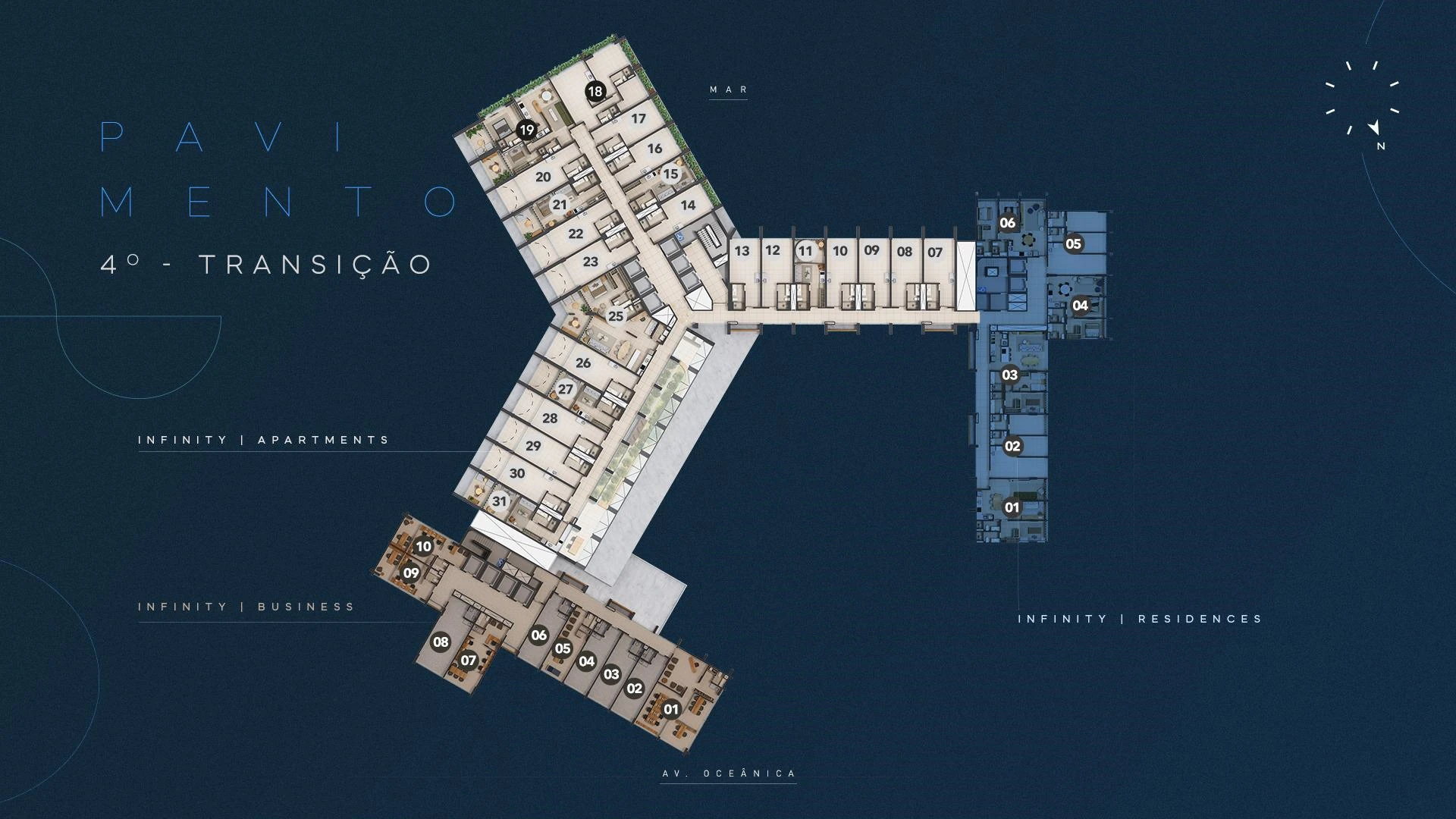 Infinity Business é a torre exclusivamente corporativa do complexo, com salas comerciais entre 30 m² e 91 m², garden com áreas descobertas para os andares mais baixos e possibilidade de laje corporativa. Com acesso independente, lobby exclusivo na Av. Oceânica, auditório, foyer com bar e infraestrutura de alto padrão, o Infinity Business entrega um endereço empresarial sem equivalente em Salvador: vista para o mar, localização estratégica e ambiente que eleva a percepção de qualquer negócio.