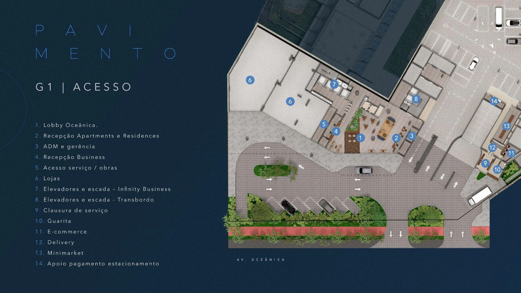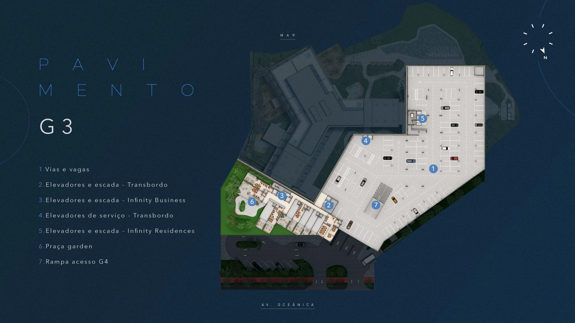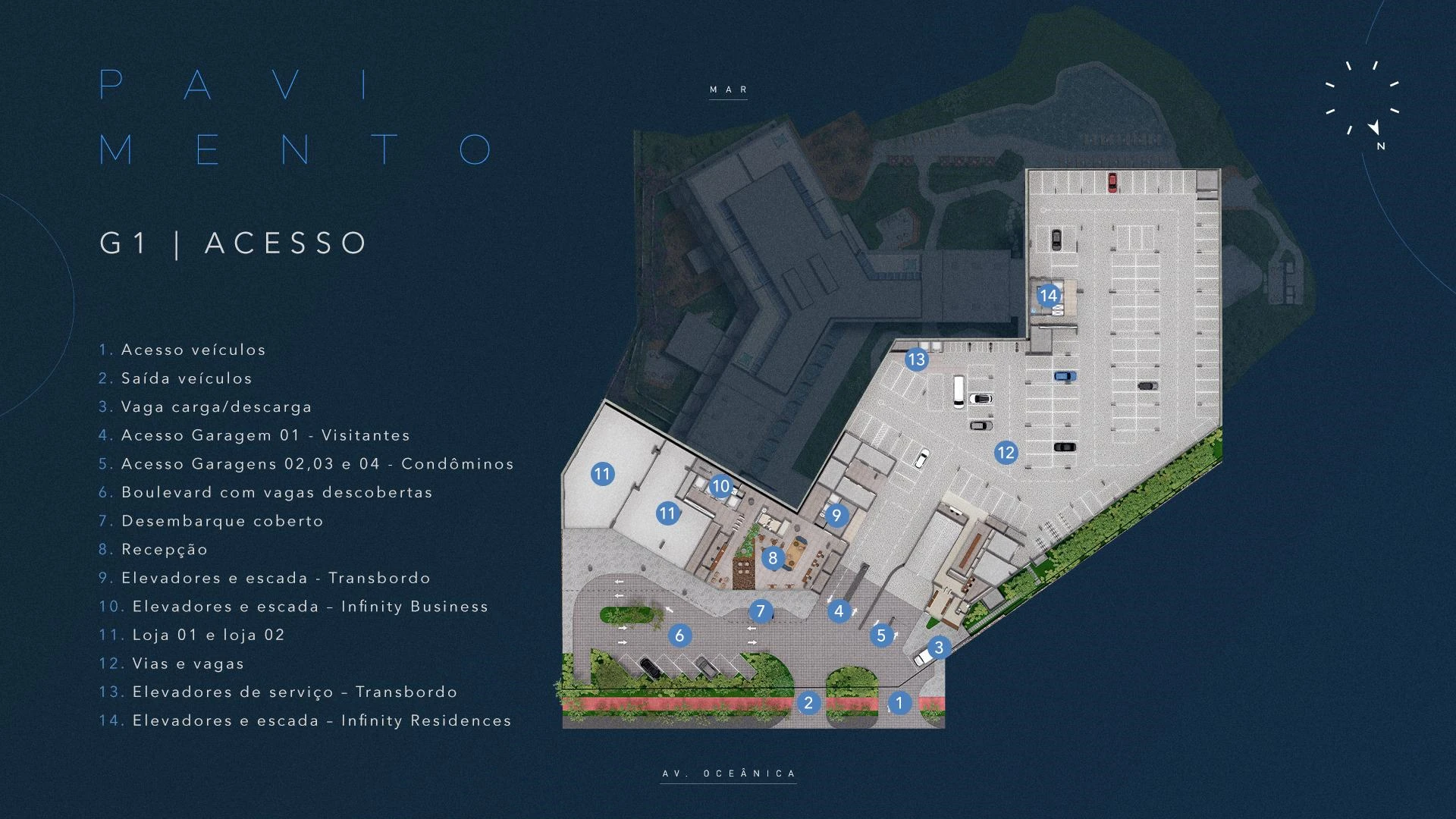 Infinity Business é a torre exclusivamente corporativa do complexo, com salas comerciais entre 30 m² e 91 m², garden com áreas descobertas para os andares mais baixos e possibilidade de laje corporativa. Com acesso independente, lobby exclusivo na Av. Oceânica, auditório, foyer com bar e infraestrutura de alto padrão, o Infinity Business entrega um endereço empresarial sem equivalente em Salvador: vista para o mar, localização estratégica e ambiente que eleva a percepção de qualquer negócio.