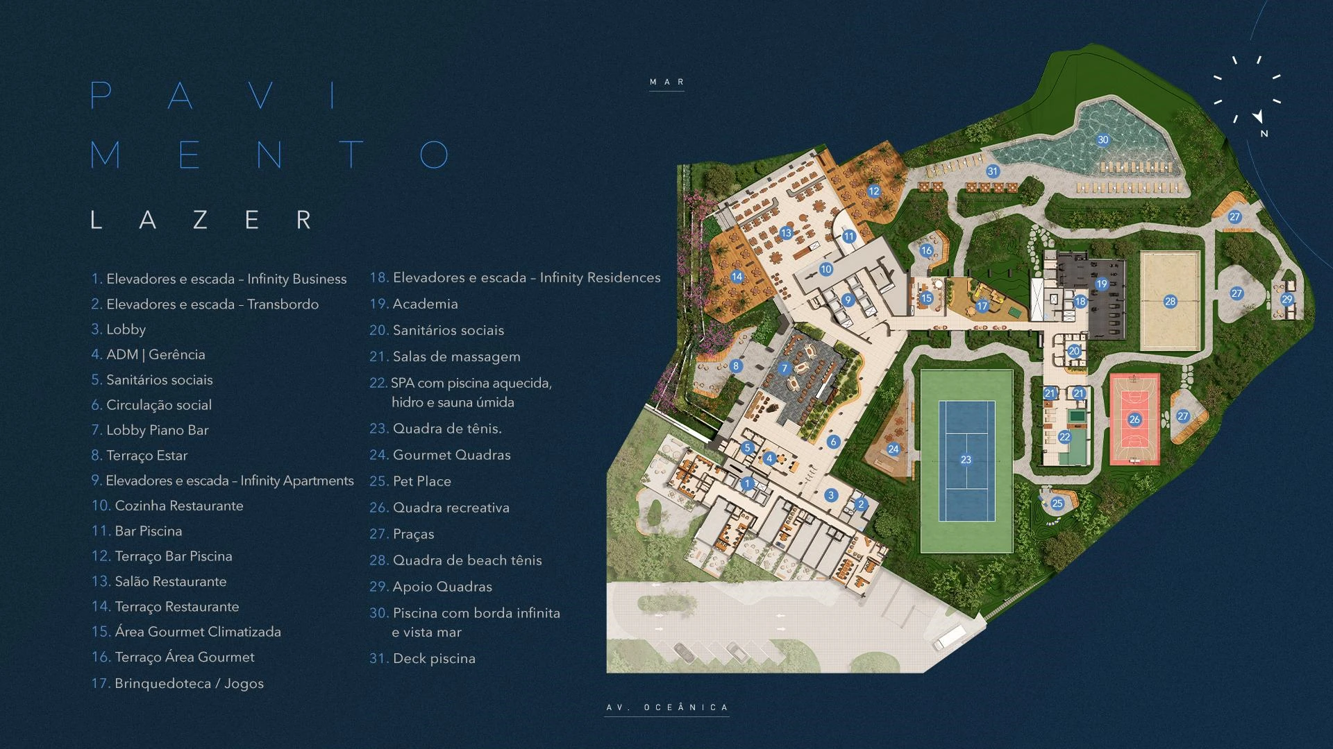 Com pavimento de lazer completo, o Infinity Salvador entrega mais de 30 itens de infraestrutura coletiva, entre eles: piscina com borda infinita e vista para o mar, deck molhado, Lobby Piano Bar com referências ao legado Othon, restaurante com terraço, área gourmet climatizada, SPA com piscina aquecida, sauna úmida e salas de massagem, academia equipada, brinquedoteca, pet place, quadra de tênis, beach tennis e quadra recreativa.