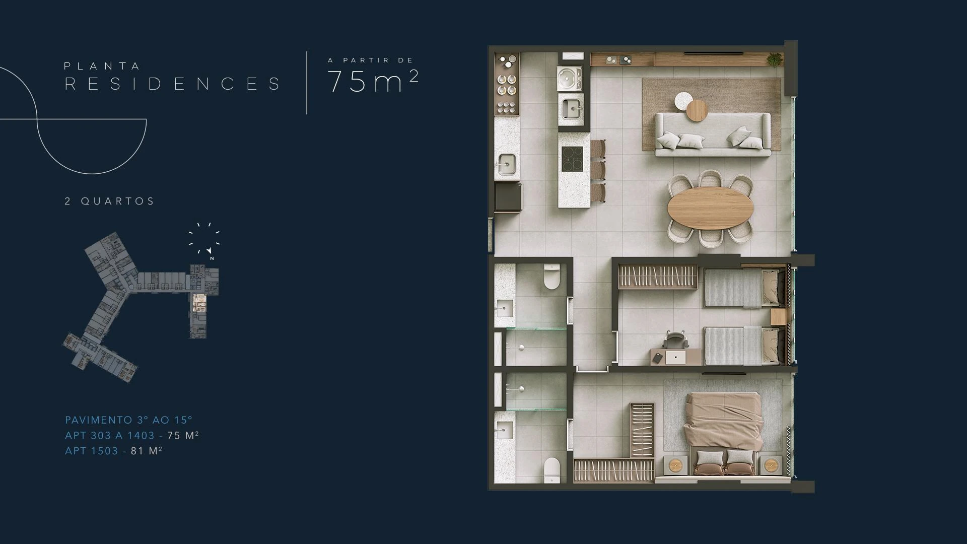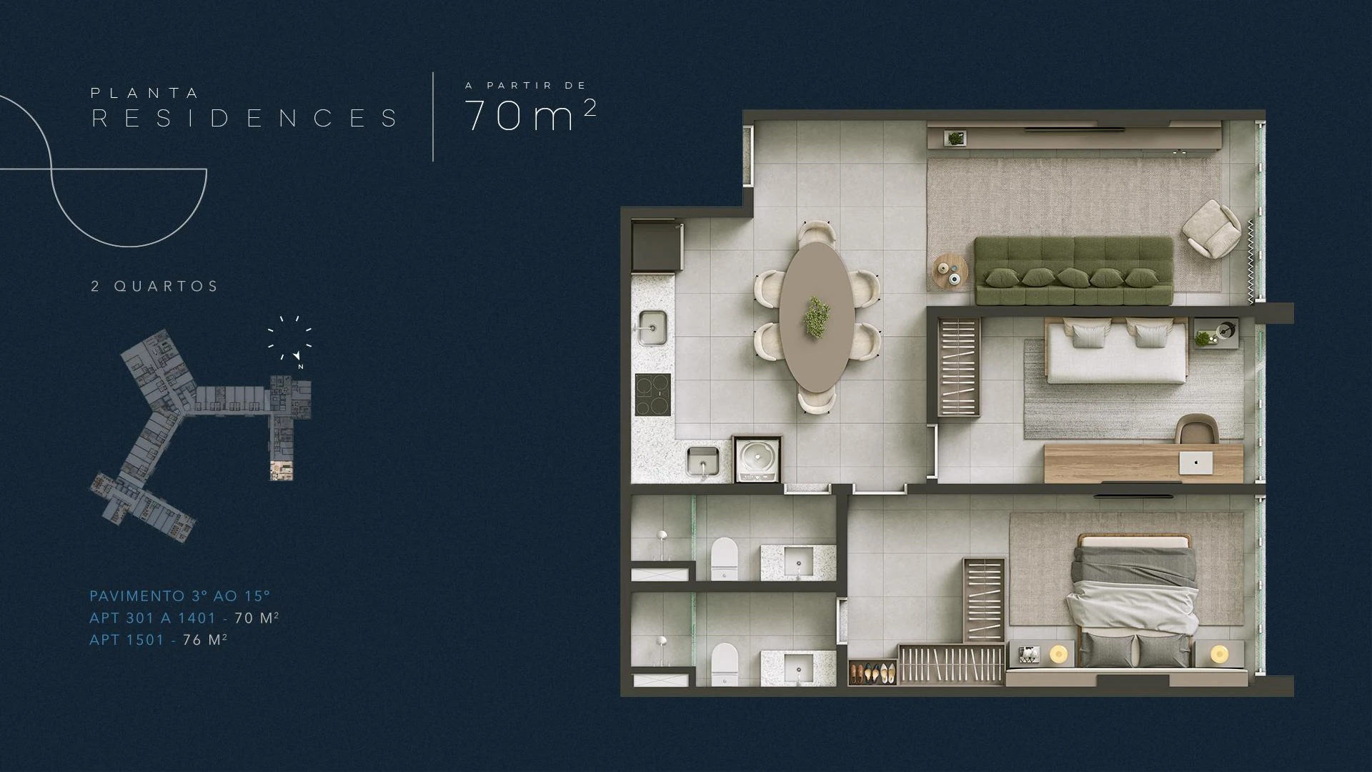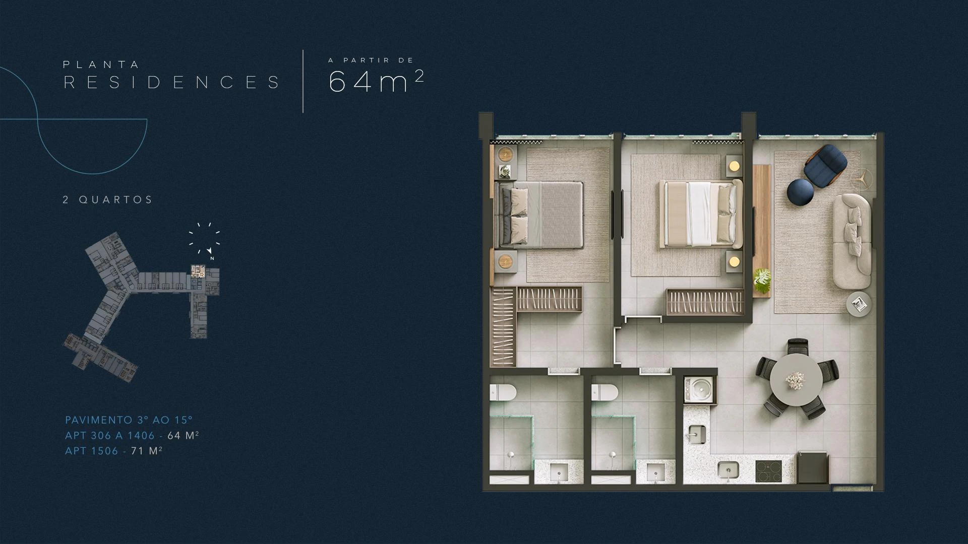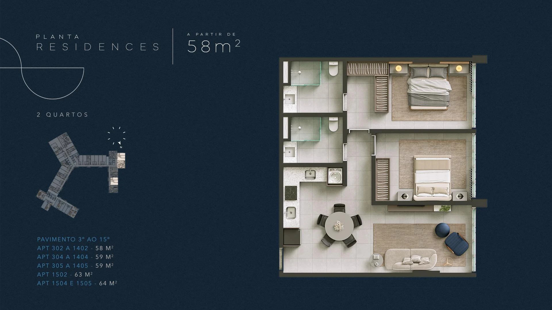 Infinity Residences apresenta unidades a partir de 58 m² com dois quartos, distribuídas do 3º ao 15º pavimento, ideais para moradia permanente com toda a infraestrutura condominial de um hotel de luxo. Com projeto assinado e materiais de primeira linha, cada apartamento foi concebido para entregar conforto real no cotidiano à beira-mar.