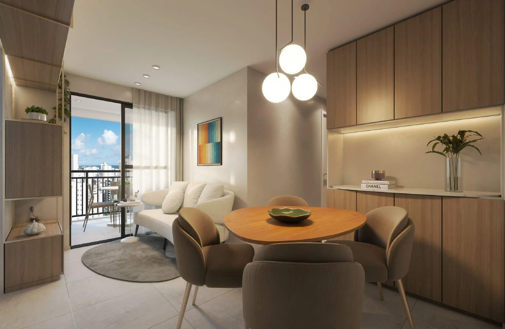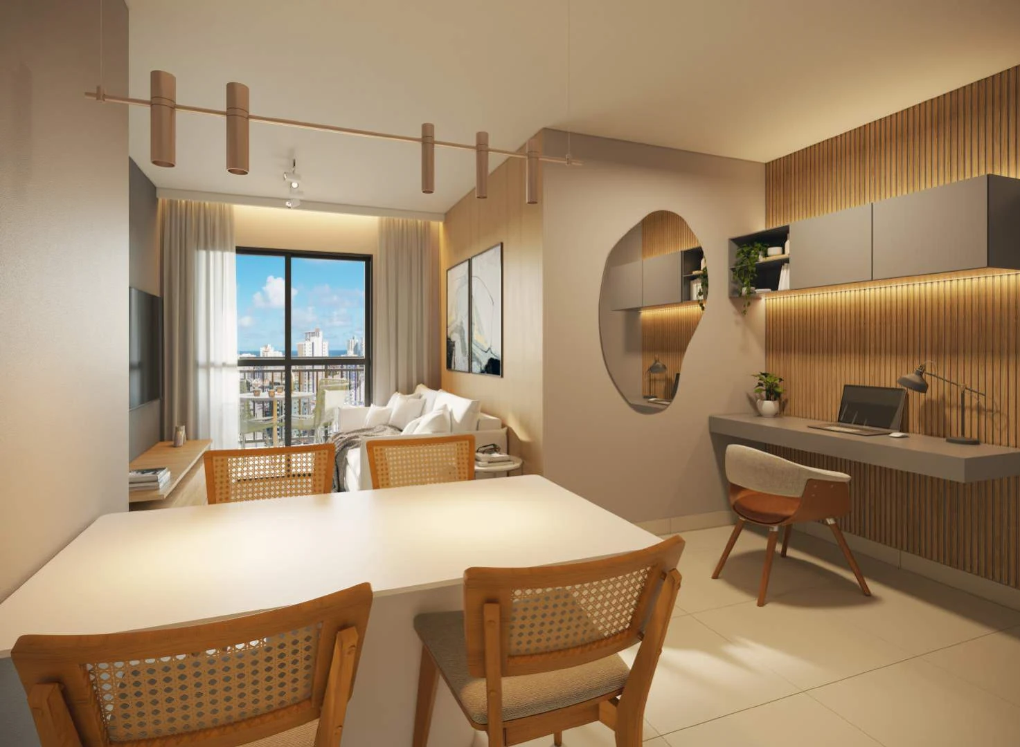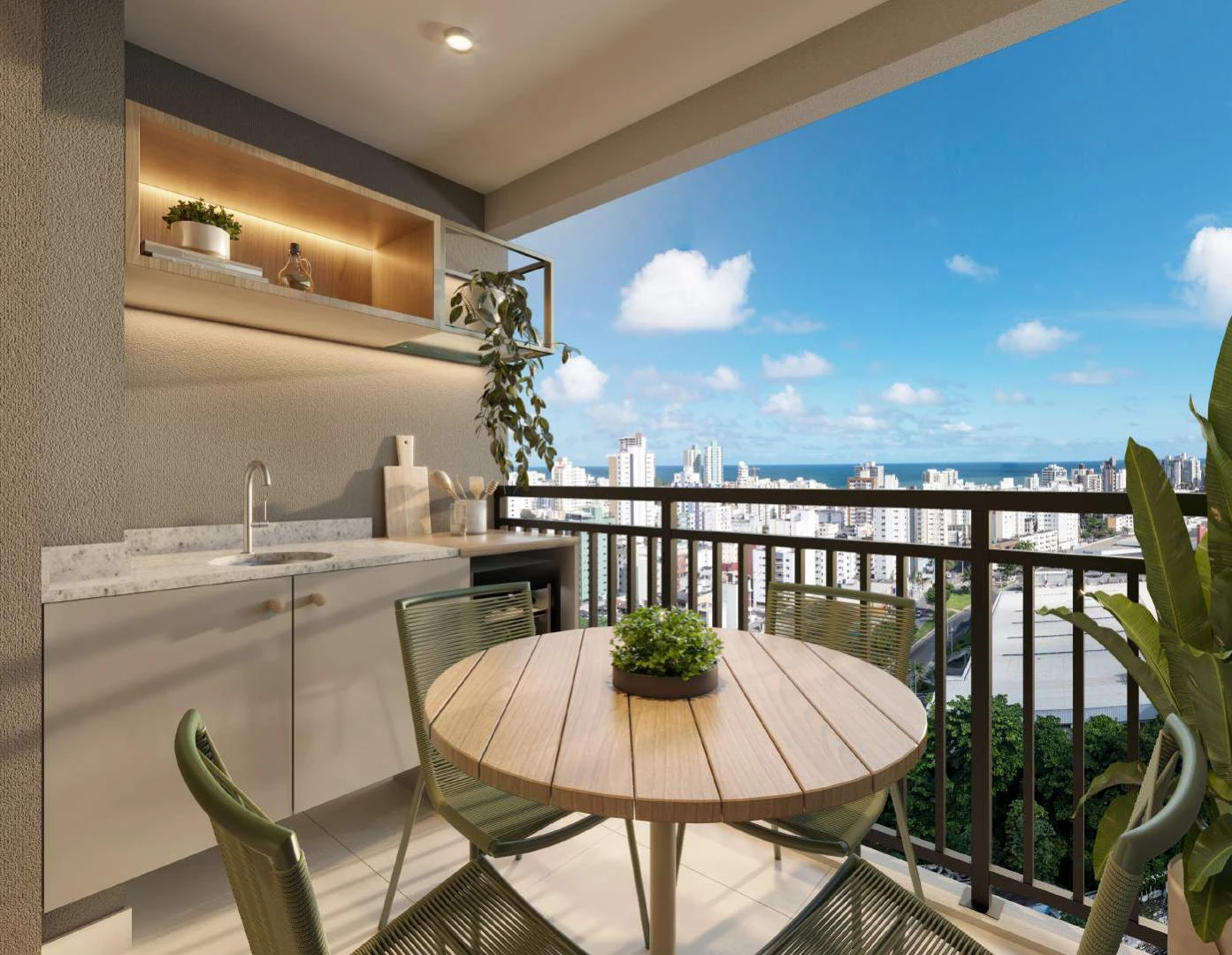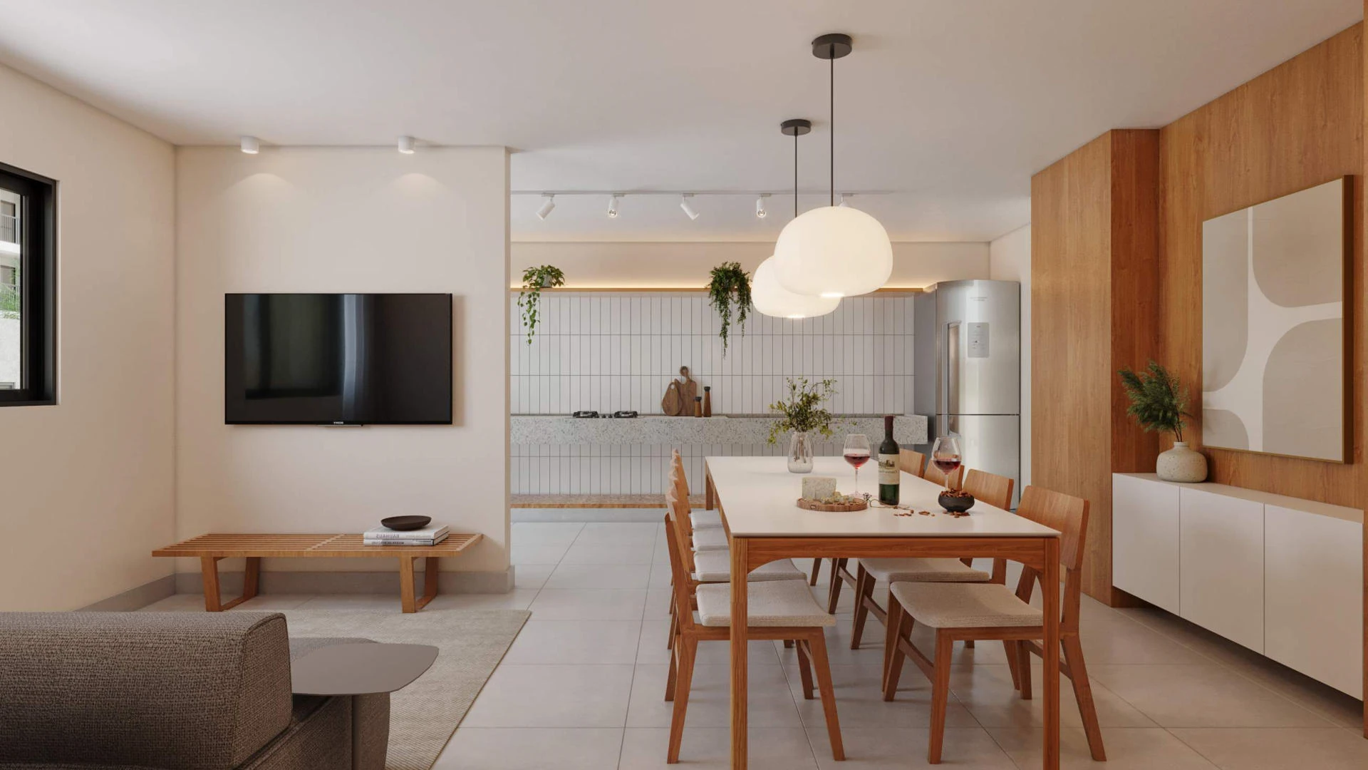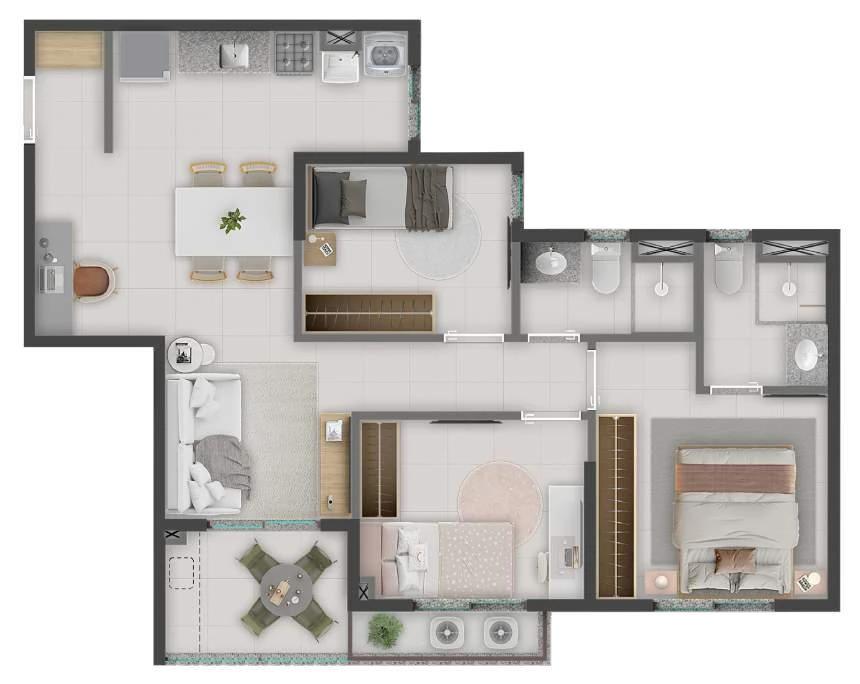 Cada apartamento foi projetado com varanda gourmet integrada ao living, garantindo um espaço versátil para receber amigos, relaxar ou trabalhar. São dois tipos de unidades padrão: o Apto Comfort de 65,59 m², com 3 quartos e 1 suíte, e o Apto Smart de 53,30 m², com 2 quartos e 1 suíte. Todas as unidades incluem 1 vaga de garagem e foram projetadas com plantas inteligentes que aproveitam cada metro quadrado com eficiência.