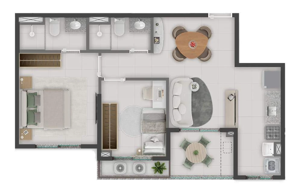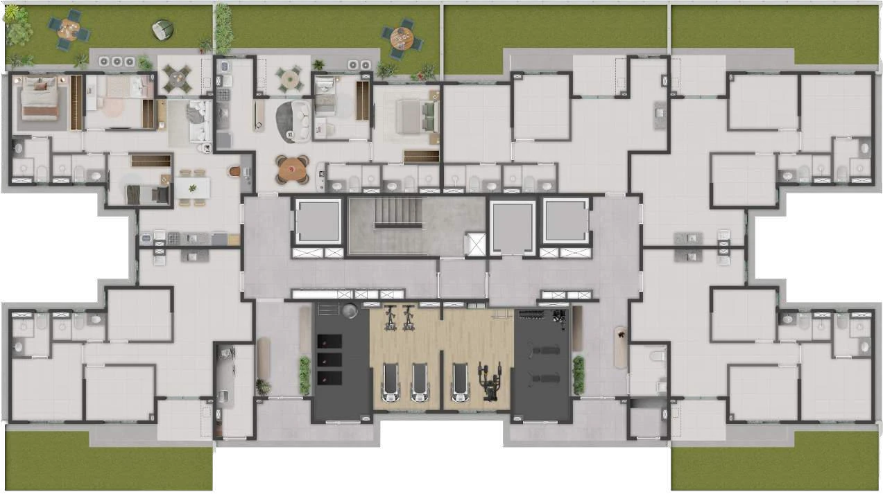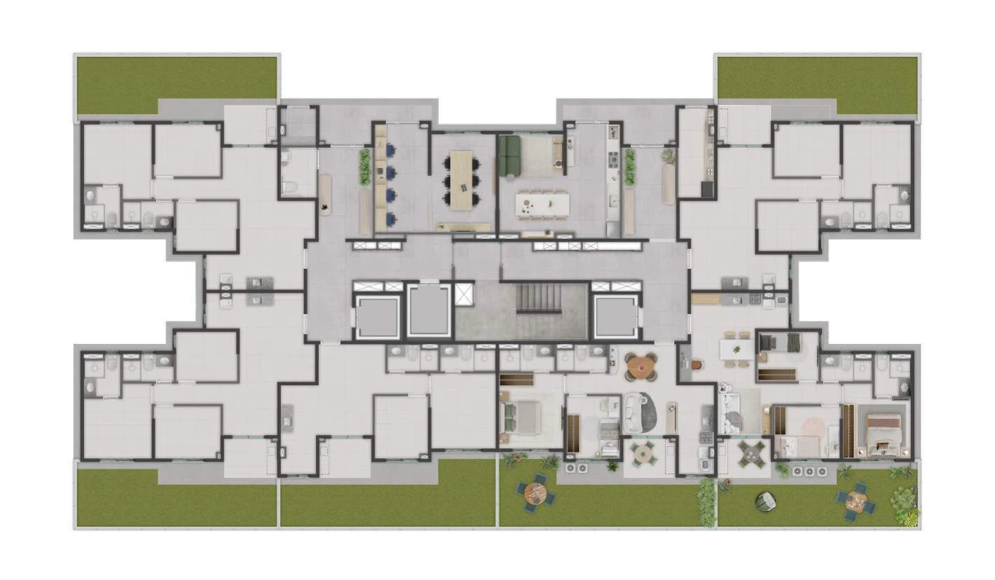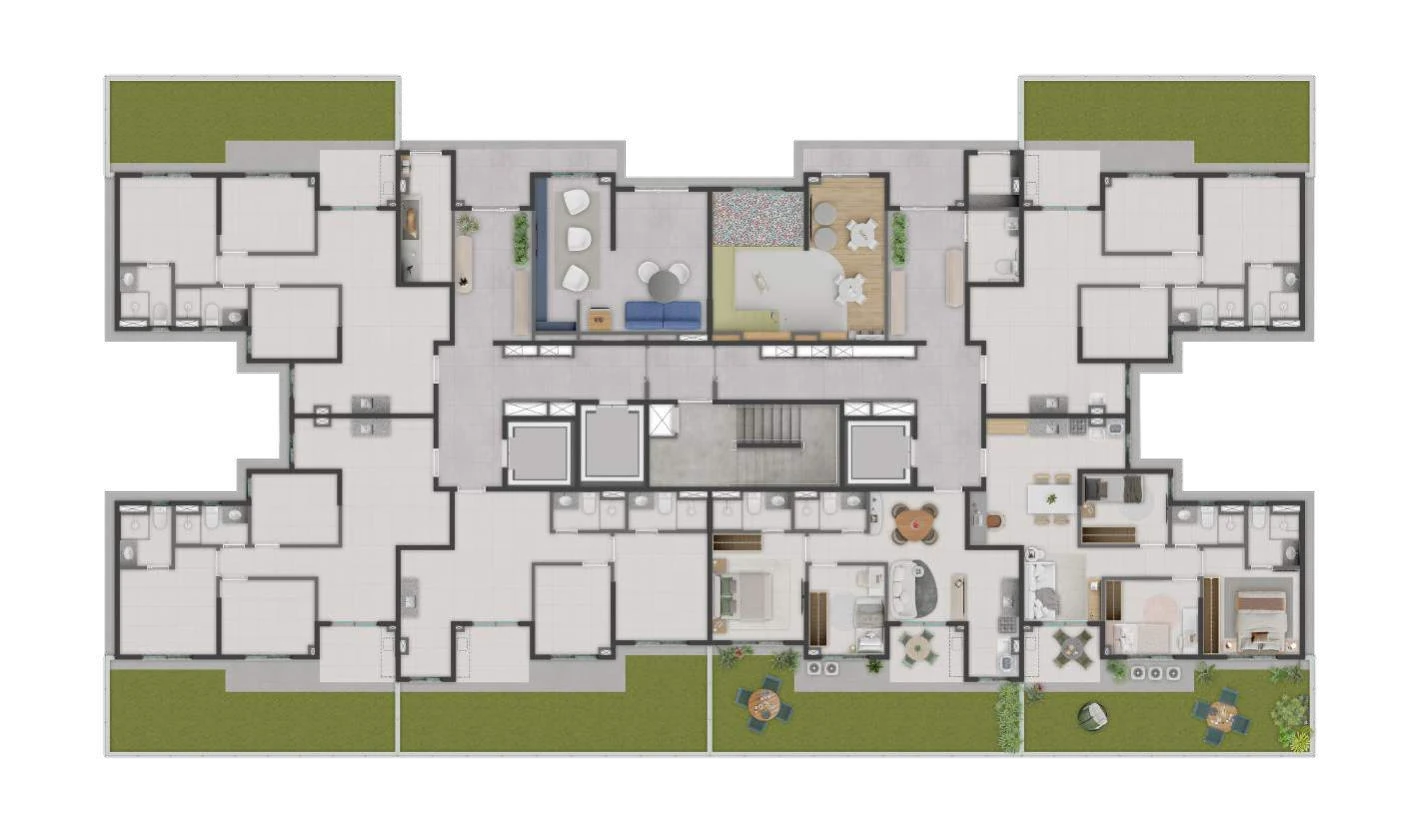 Para quem deseja ainda mais conexão com o espaço externo, as unidades Garden no térreo oferecem áreas privativas ajardinadas, disponíveis nas versões de 79,63 m² (2 quartos) e 90,00 m² ou 90,17 m² (3 quartos), todas com 1 suíte e 1 vaga.