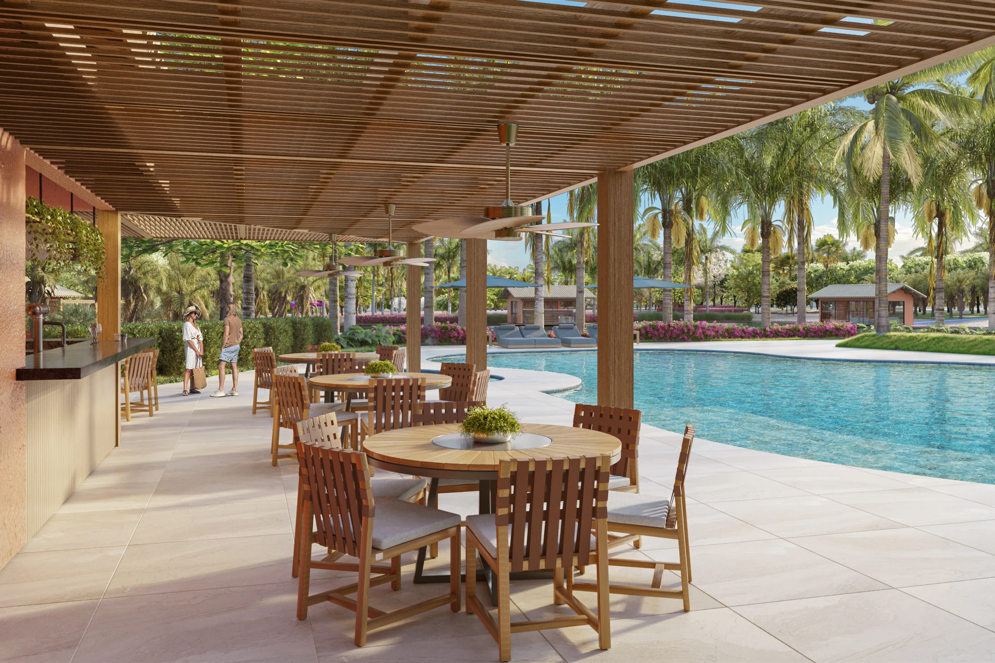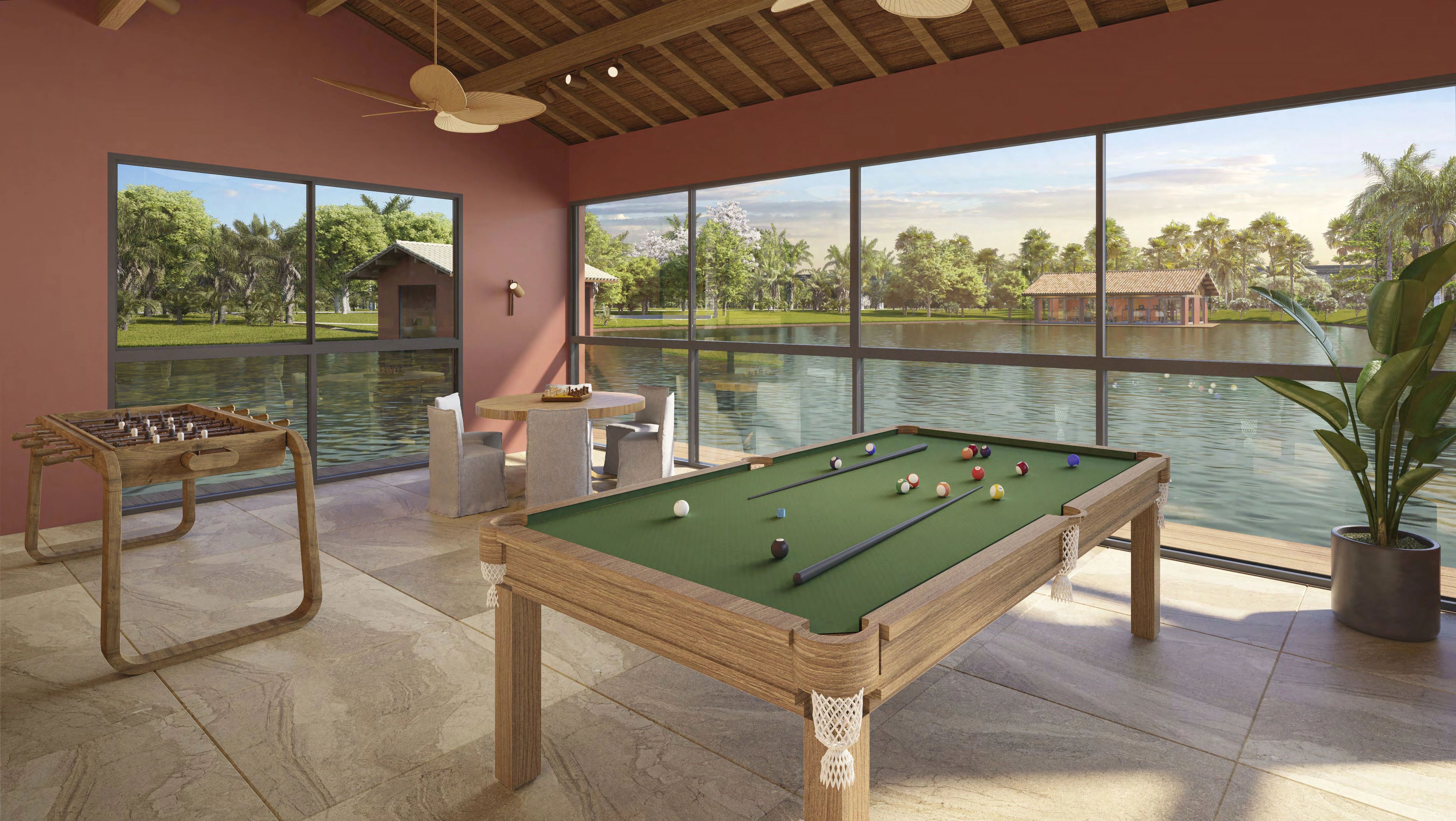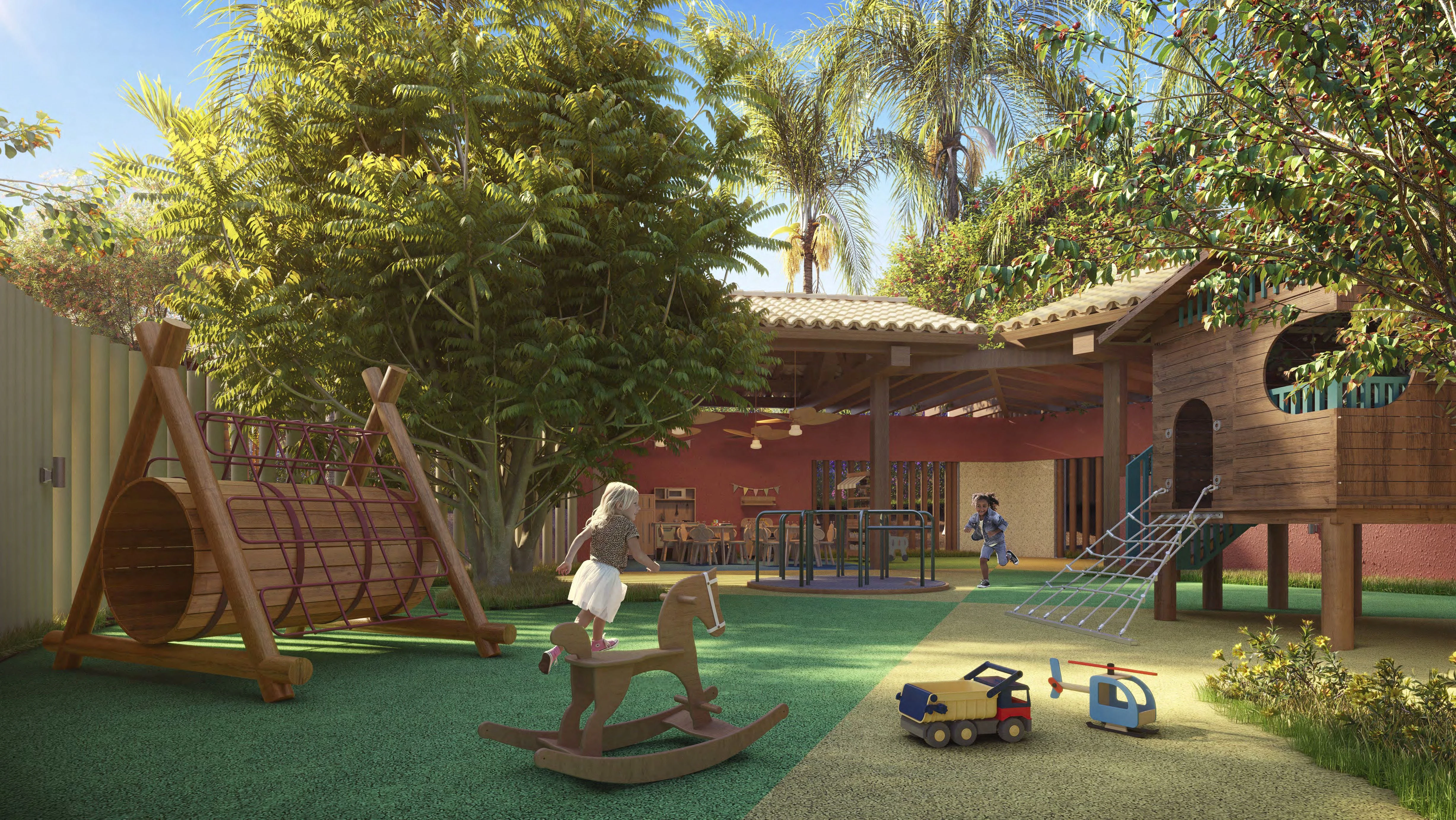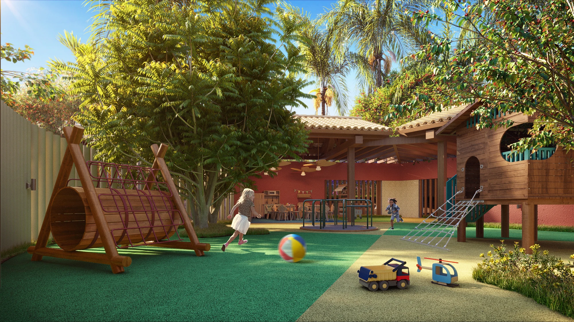 Além disso, o Clube Infantil foi projetado com brinquedos em madeira natural, playground temático e espaço coberto para atividades supervisionadas. O Espaço Hangout, integrado à lagoa por meio de grandes janelas de vidro, funciona como sala de estar coletiva, com ambientação sofisticada e conectividade para quem quer trabalhar ou relaxar num cenário único.