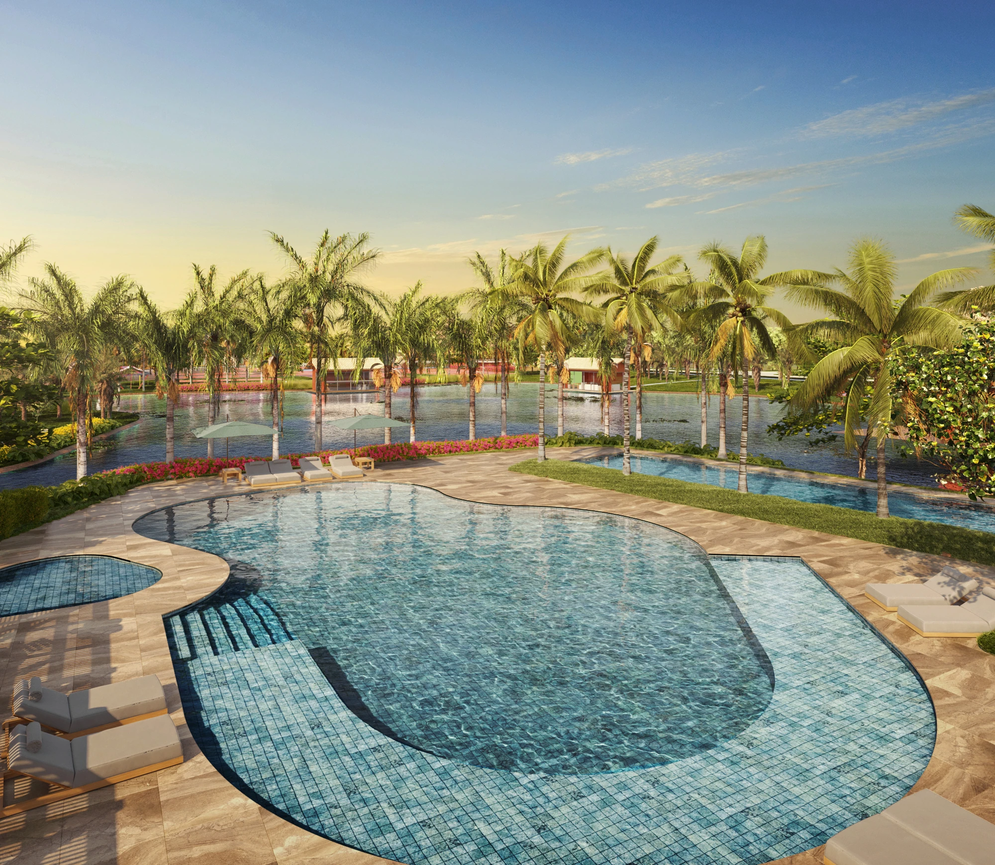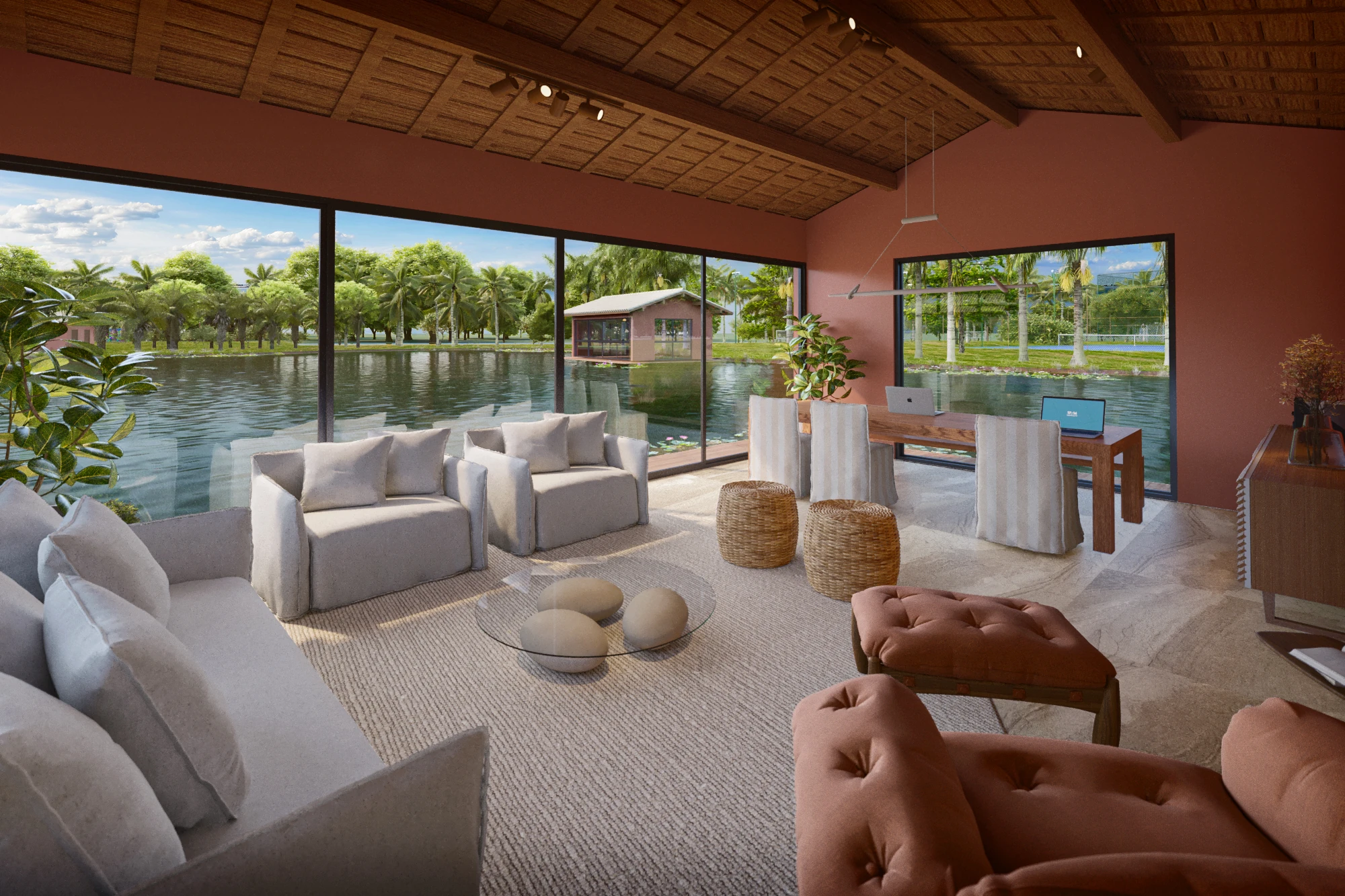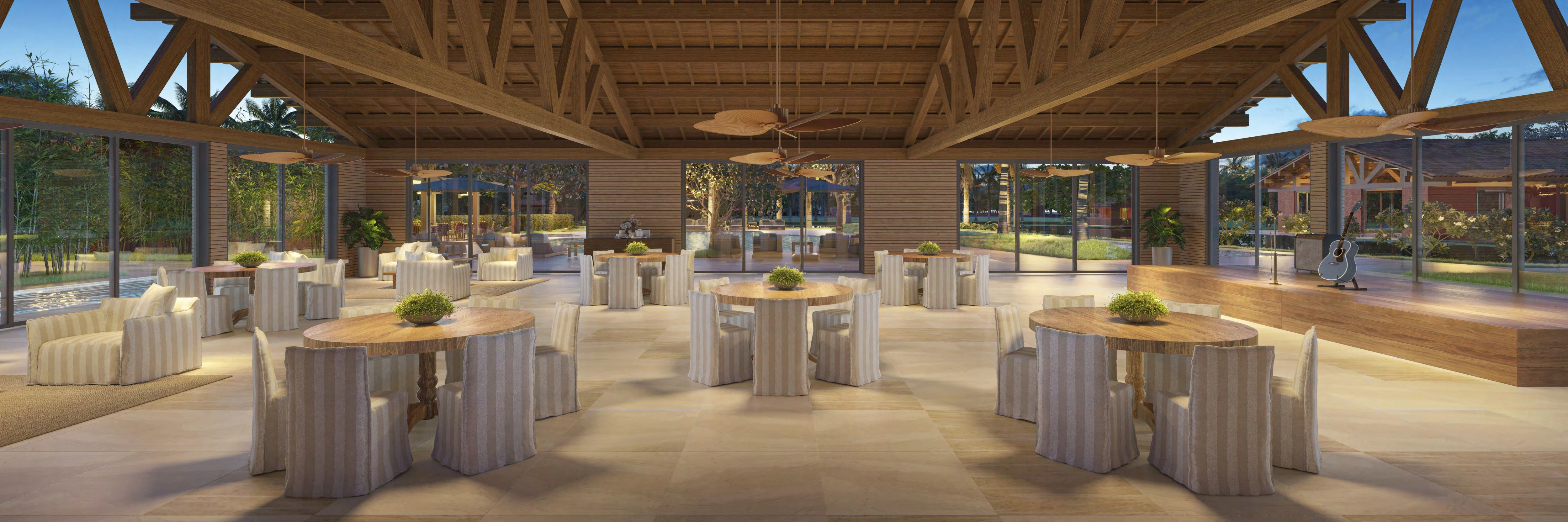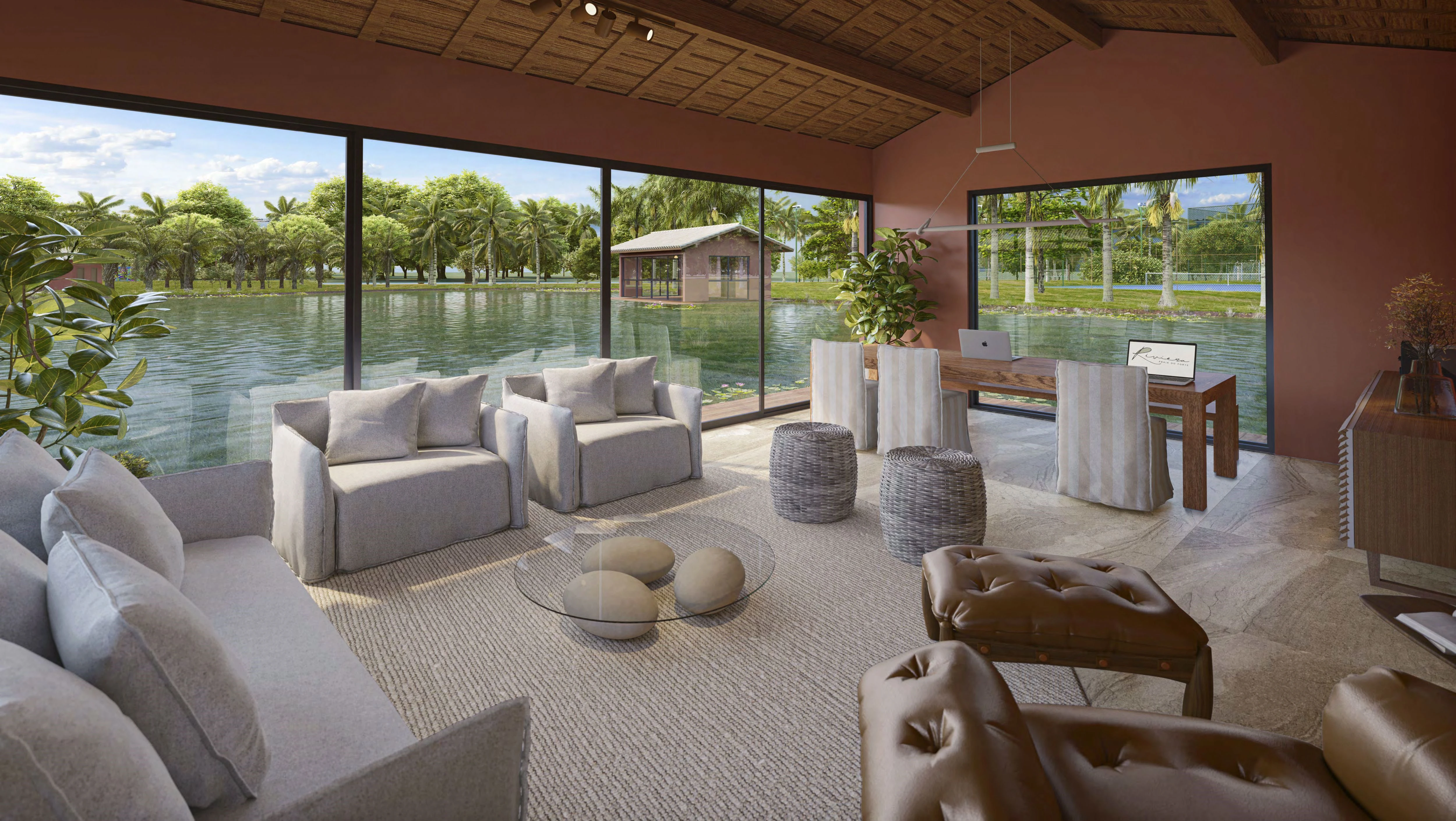 Além disso, o Clube Infantil foi projetado com brinquedos em madeira natural, playground temático e espaço coberto para atividades supervisionadas. O Espaço Hangout, integrado à lagoa por meio de grandes janelas de vidro, funciona como sala de estar coletiva, com ambientação sofisticada e conectividade para quem quer trabalhar ou relaxar num cenário único.