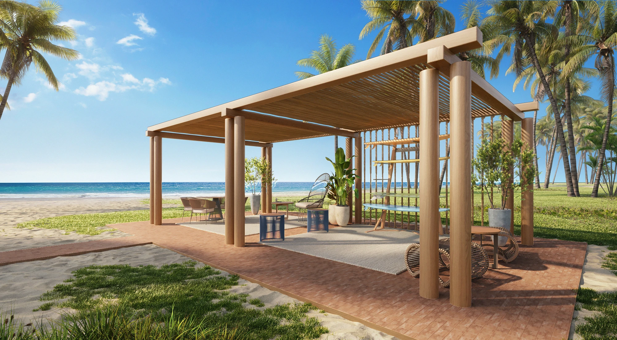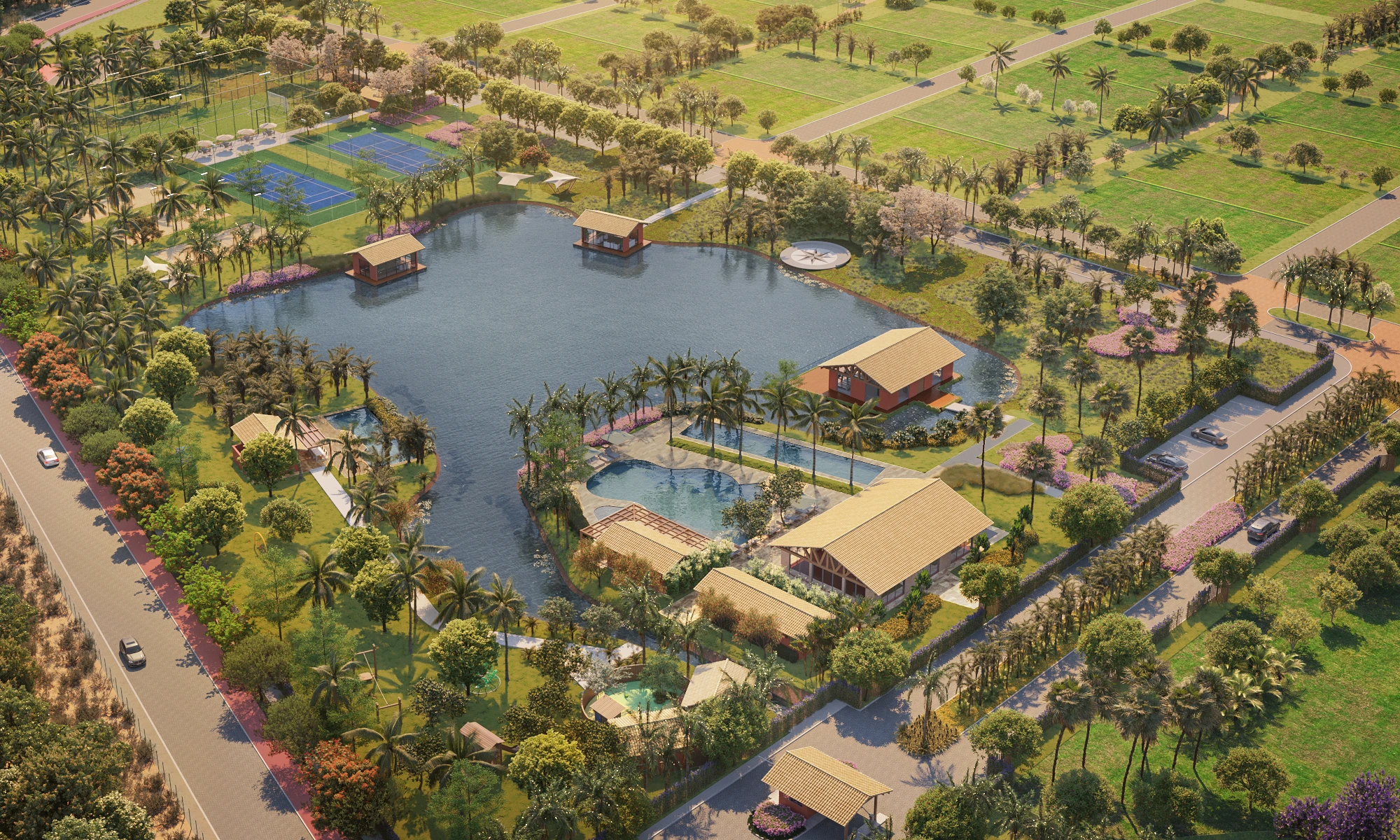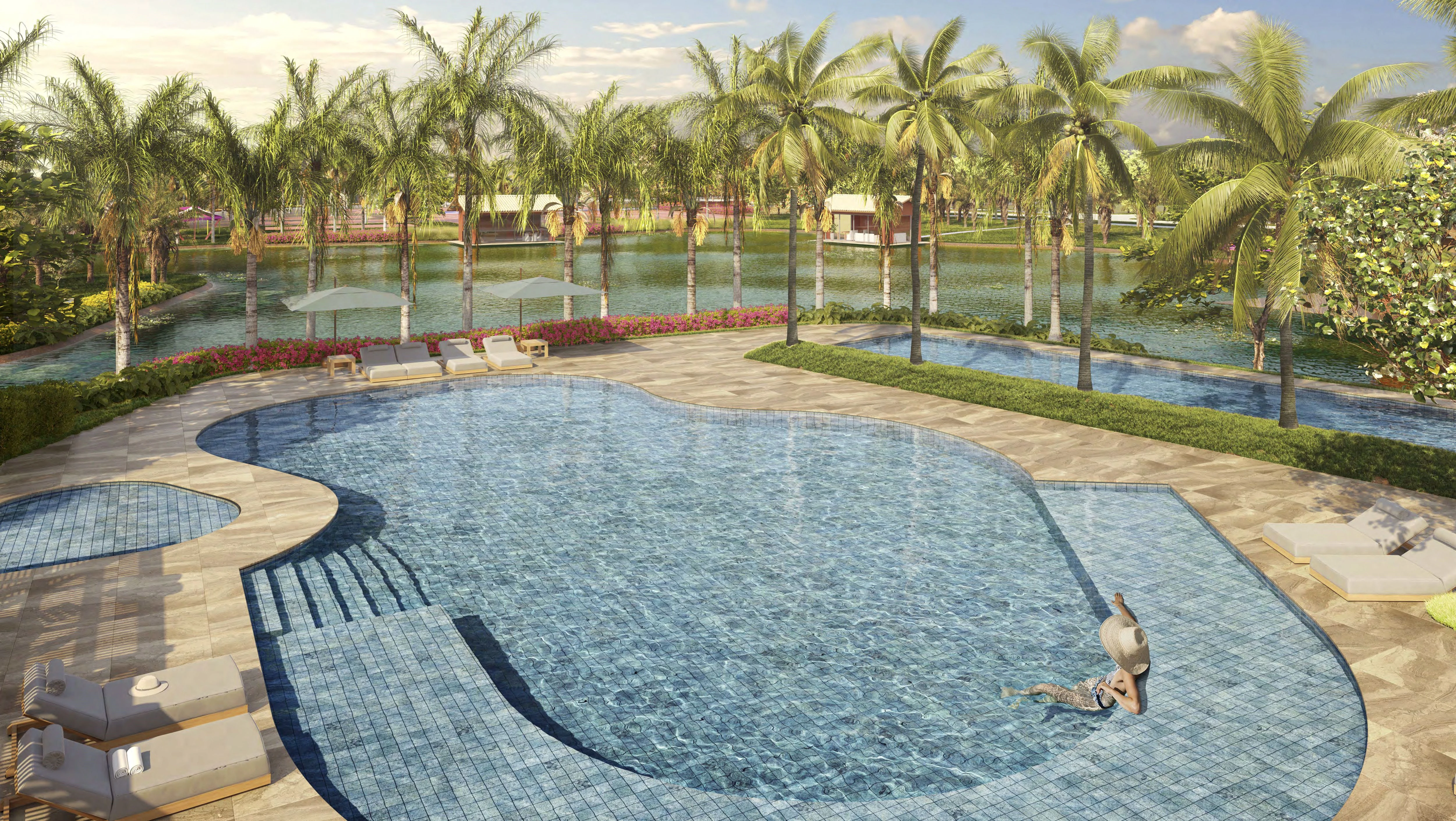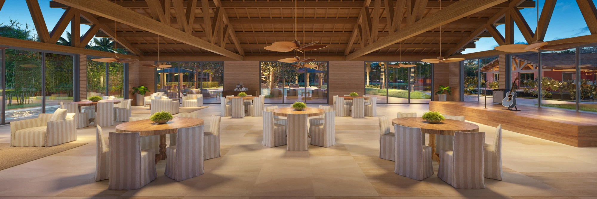Além disso, o Clube Infantil foi projetado com brinquedos em madeira natural, playground temático e espaço coberto para atividades supervisionadas. O Espaço Hangout, integrado à lagoa por meio de grandes janelas de vidro, funciona como sala de estar coletiva, com ambientação sofisticada e conectividade para quem quer trabalhar ou relaxar num cenário único.