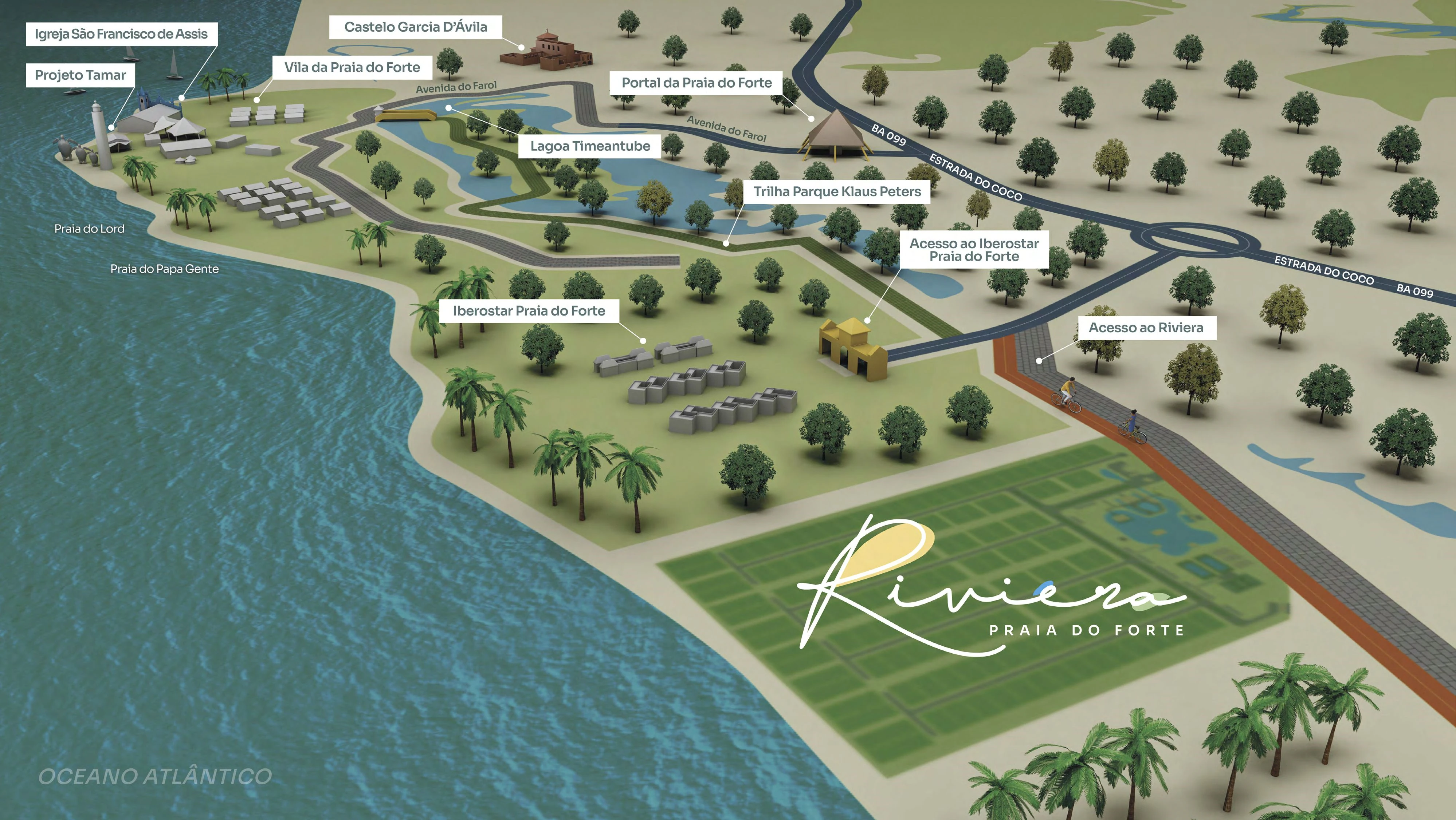 Ao lado do Iberostar Praia do Forte e a poucos minutos a pé da vila mais charmosa do litoral baiano, o Riviera oferece o que poucos empreendimentos conseguem reunir: proximidade com serviços, gastronomia e cultura local, e ao mesmo tempo um ambiente reservado, exclusivo e protegido pelo verde nativo e pelo azul do Oceano Atlântico.